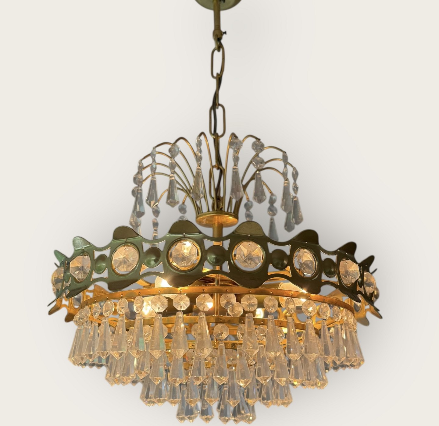 Brass chandelier with many glass prisms, works fine and with all prisms, Diameter approx. 36cm *Nice used condition*
