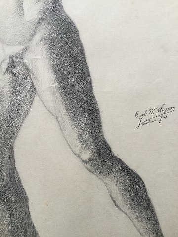 Carl V. Meyer (1870-1938): Nøgen mand - Jæger med bytte på ryggen 1894. Akademitegning. Kul på papir. Sign.: Carl V. Meyer dateret - Januar 94 Uden ramme 78x45 12725