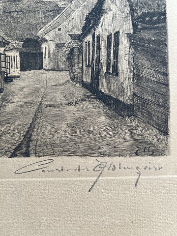 C. Holmqvist (20 årh): Parti fra landsby. Sign.: CH (i trykket) og i bly Constantin C. Holmqvist (??) Uden ramme Pladen 22x17½ - Arket 29x25 2722