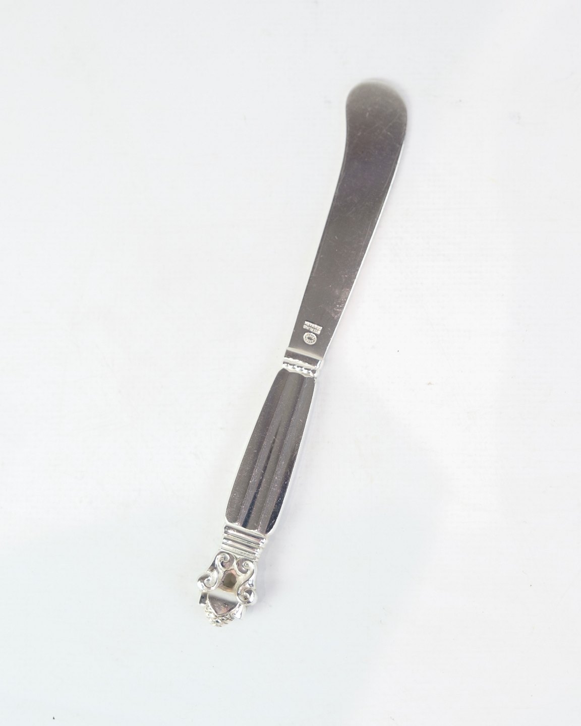 Georg Jensen smørkniv i sterling sølv. Konge mønster, design af Johan Rohde 1915. Model No. 046. Længde 15 cm.