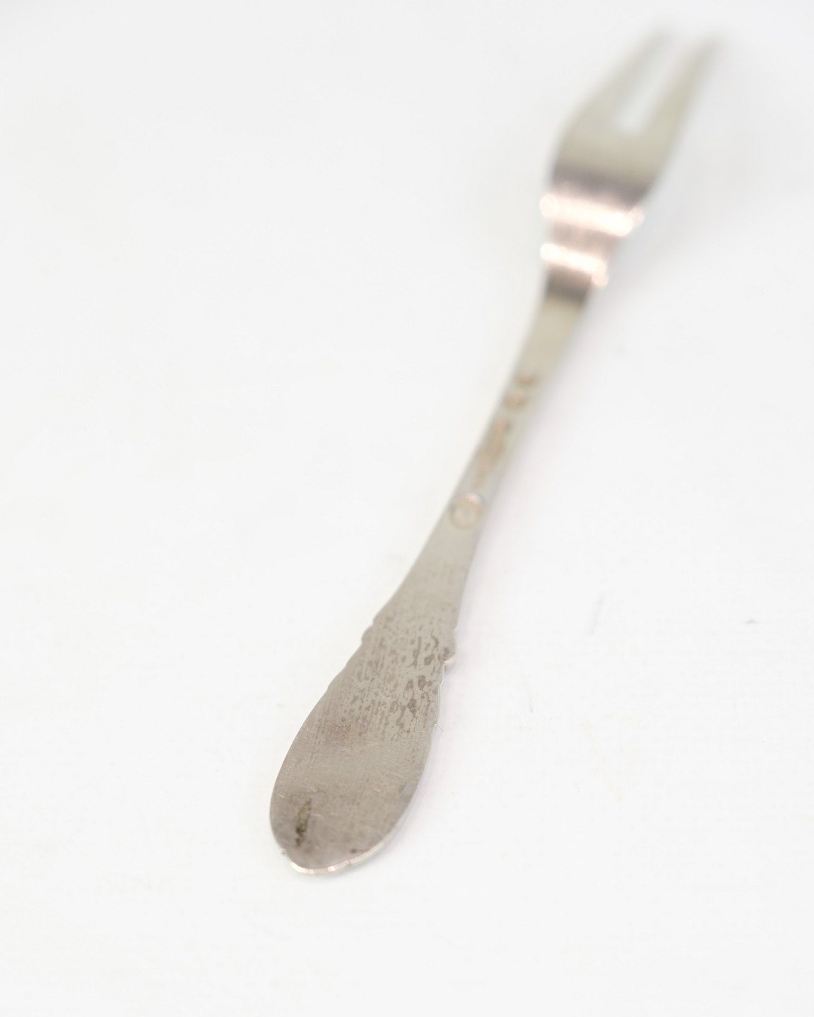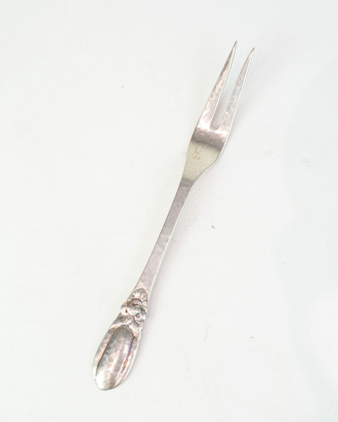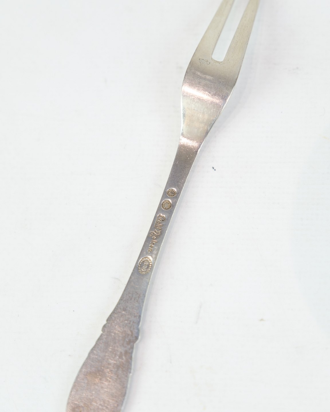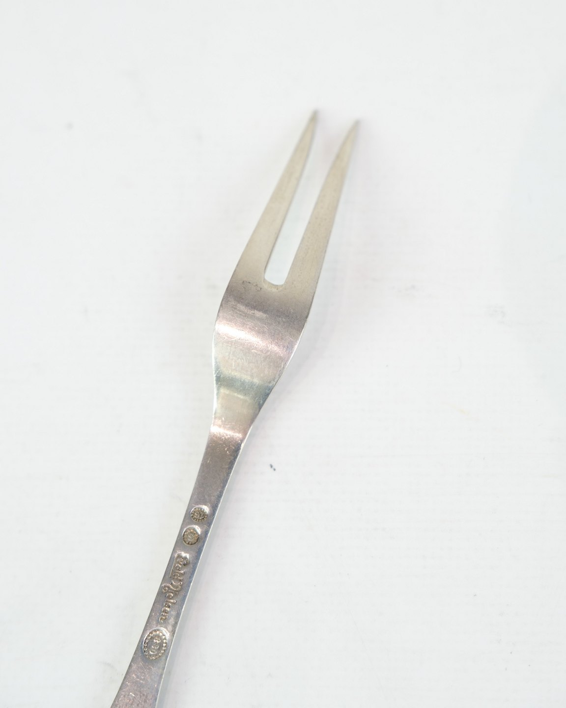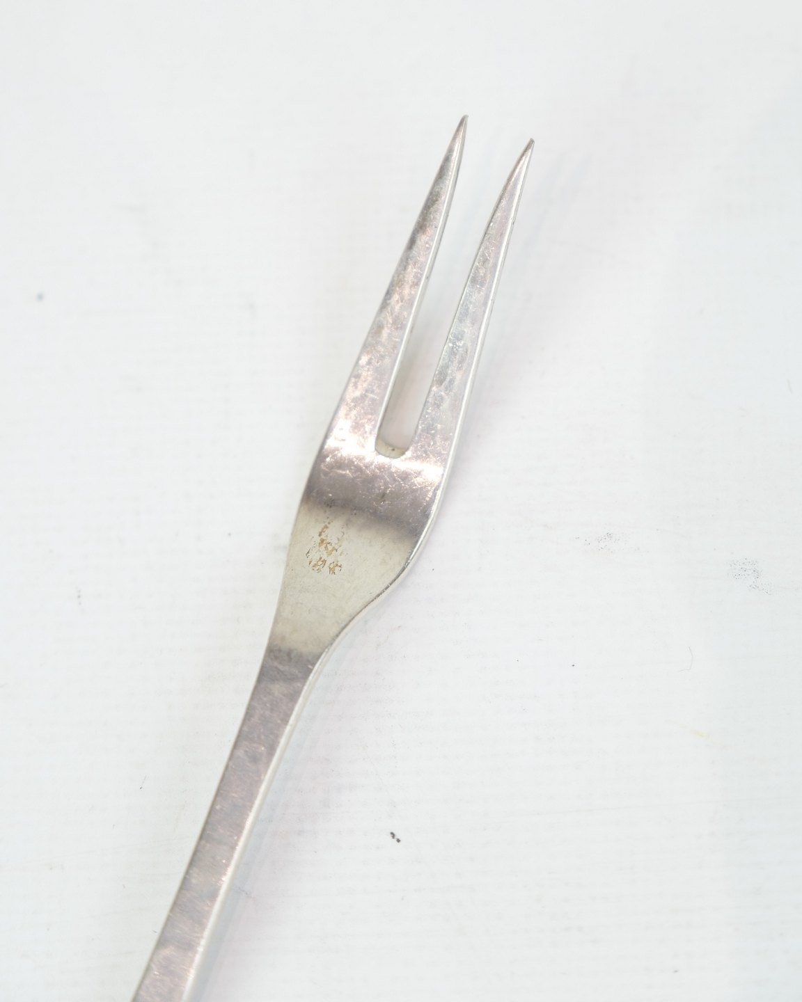 Evald Nielsen cold cuts fork in genuine silver. Hammered pattern, Model No. 16. Length 15 cm. Classic Danish silverwork.