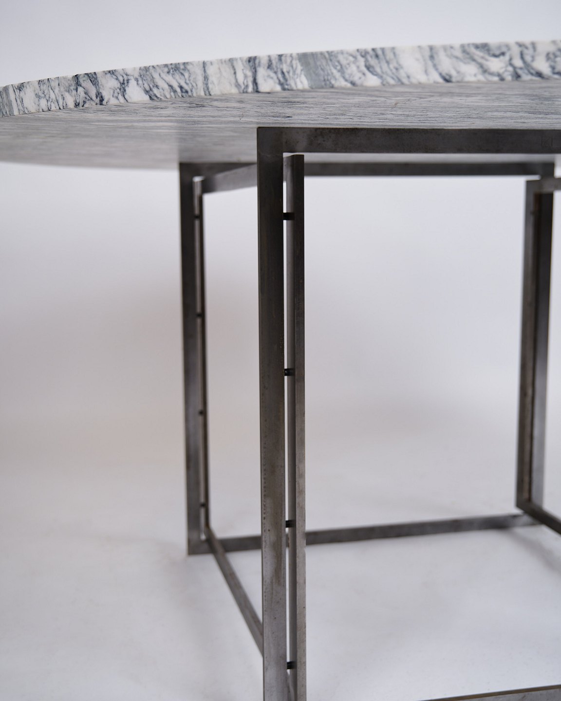 Sjældent spisebord, model PK54, designet af Poul Kjærholm og produceret af E. Kold Christensen i 1960’erne. Bordet er udført med en massiv rund cipollini-marmorplade, båret af et stålstel, karakteristisk for Kjærholms minimalistiske formsprog.