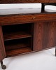 bar cabinet from Dyrlund, made of rosewood with black formica and handles in solid rosewood. The cabinet is mounted on wheels for easy mobility and has a foldable top that can expand the width from 86 cm to 142 cm. The combination of exclusive materials and functional design makes this bar cabinet a classic example of Danish furniture craftsmanship from the 1960s.
