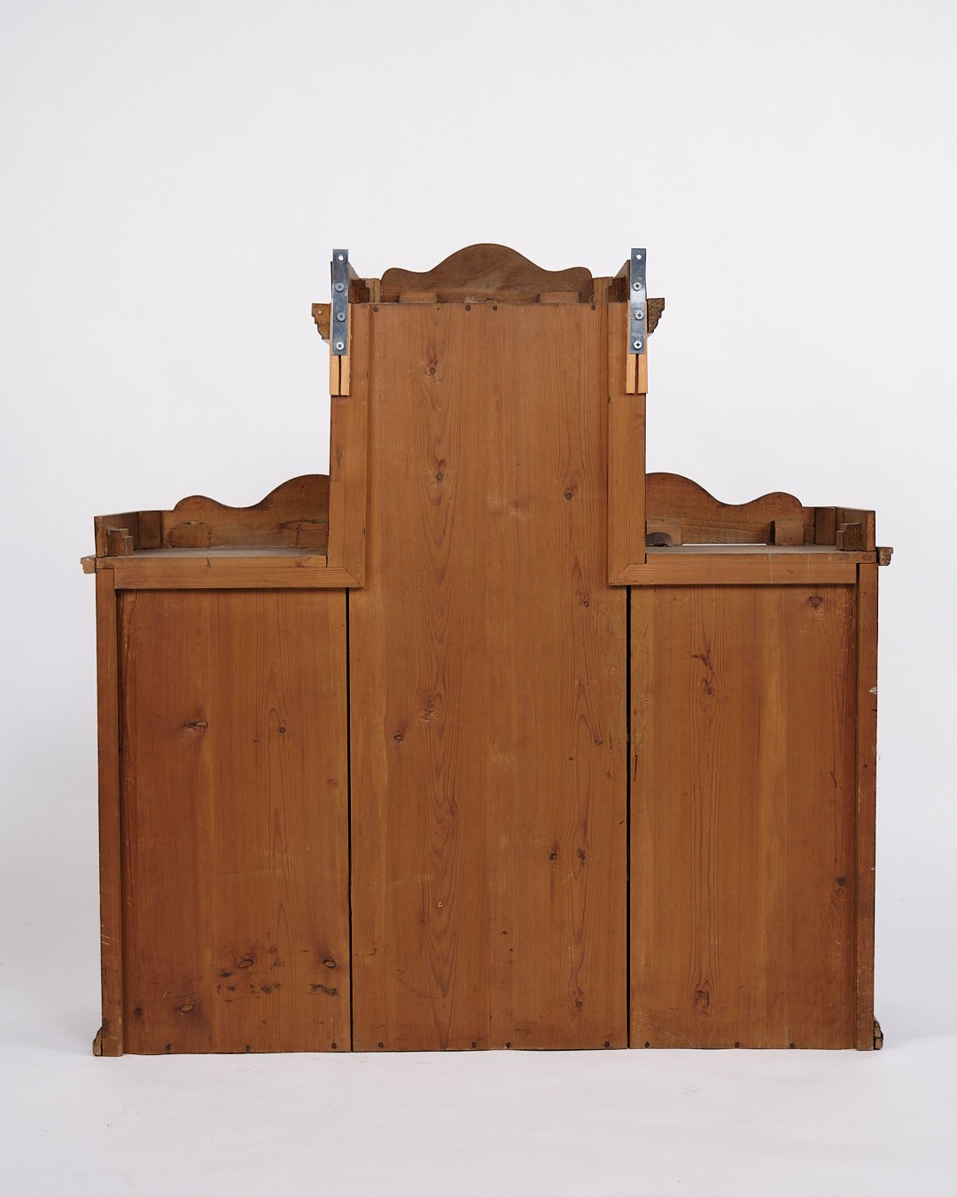 væghængt vitrineskab fra 1890’erne, udført i håndpoleret mahogni. Skabet har klassiske proportioner og fremstår med et tidstypisk design fra slutningen af 1800-tallet, hvor funktionalitet og dekorativt udtryk gik hånd i hånd.