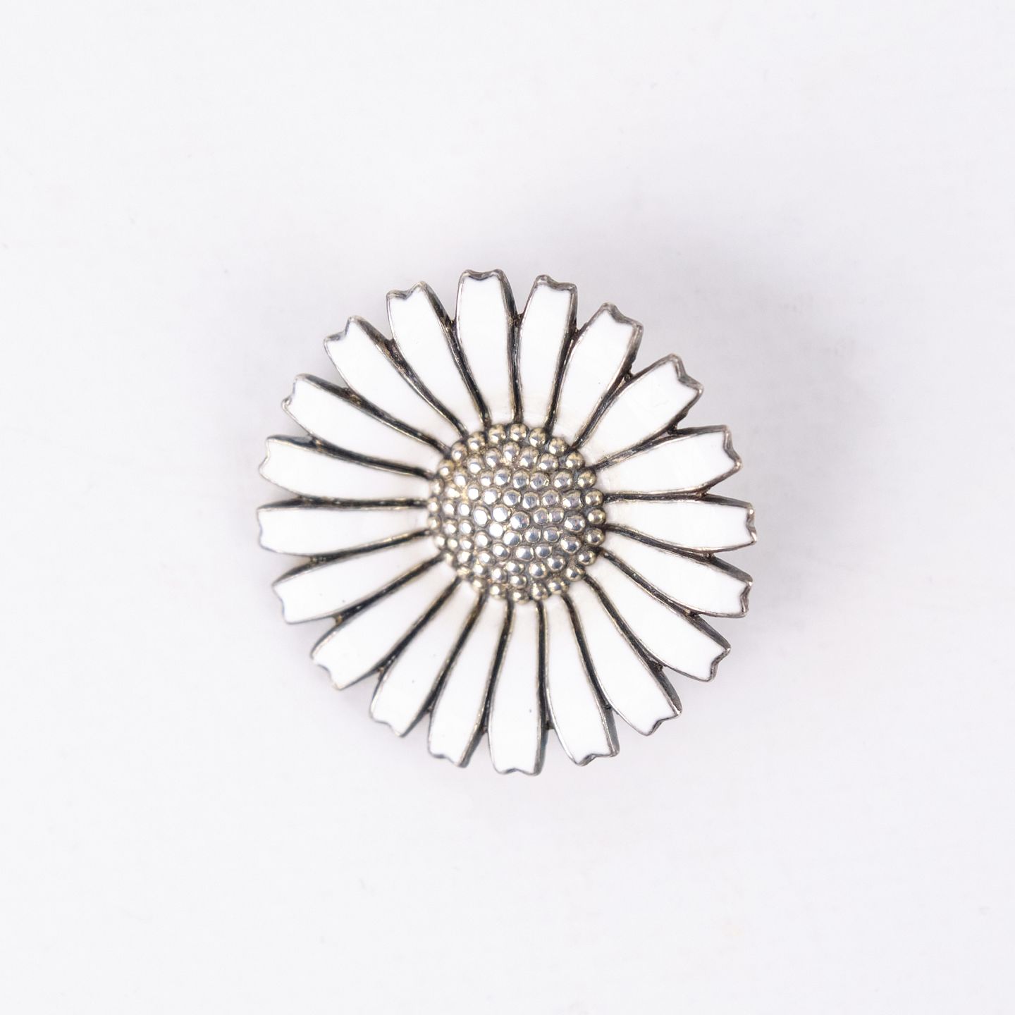 Broche fra 1940’erne udført af Anton Michelsen, stemplet AM Sterling Danmark. Forgyldt og med intakt emalje, udført i klassisk dansk smykkekunst med karakteristisk marguerit- eller blomsterinspireret formsprog. Et tidstypisk og dekorativt smykke fra en anerkendt producent.