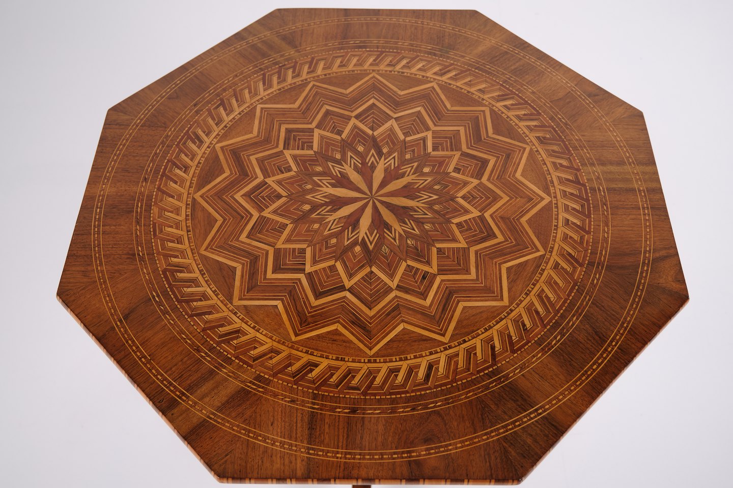 Octagonal column table from Italy, dated to the 1850s. The table is richly decorated with hand-laid intarsia, which emphasizes the geometric shapes and the overall decorative expression.