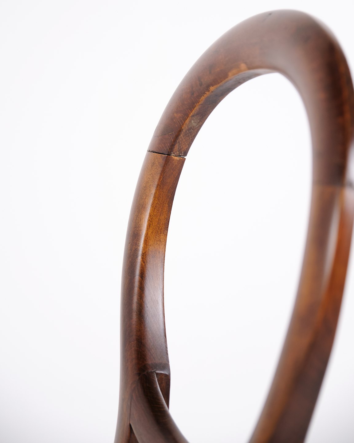 Sæt af fire salon-/spisestuestole fra 1860’erne, udført i mahogni og betrukket med lyst blomsterstof. Rokoko-inspireret design med udskårne detaljer og klassiske proportioner. Elegante stole til spisebord, stue eller entré.
