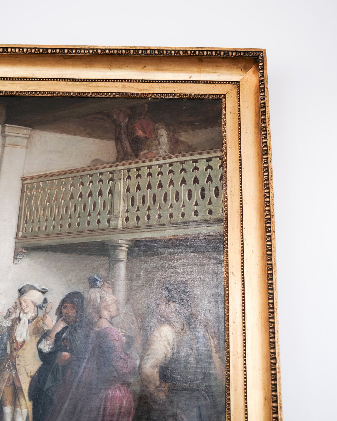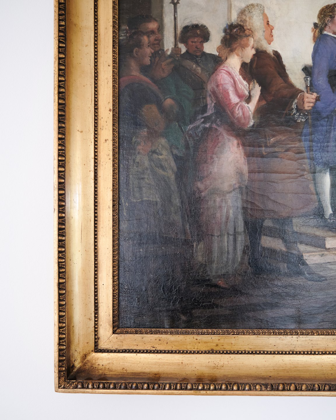 Kontakt os vedrørende prisOlie på lærred tilskrevet Wilhelm Marstrand (1810–1873), udført som en scenisk fremstilling af afslutningen på Ludvig Holbergs komedie “Det Lykkelige Skibbrud”. Maleriet er usigneret og måler 95 x 135 cm. Ny Carlsberg Glyptotek ejer en anden version af motivet (90 x 127 cm), hvor både interiør og de afbildede personer adskiller sig fra dette eksempel. Nivaagaard ejer desuden en skitse til scenen, som viser både ligheder og variationer i forhold til de to malede versioner.