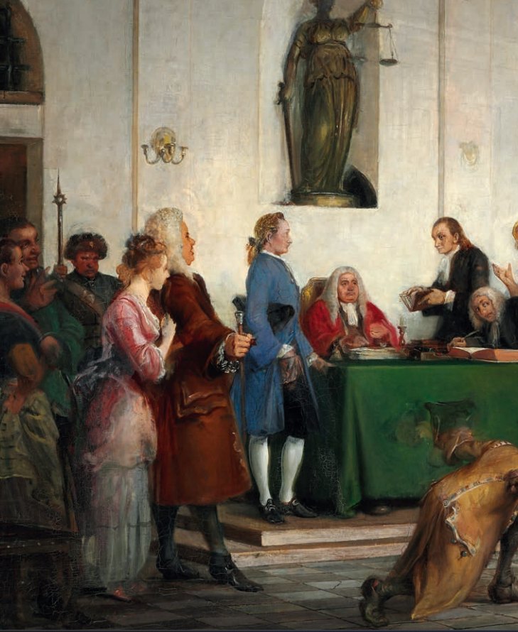 Maleriet viser den afsluttende retsscene, hvor alle er samlet for at høre dommen over Rosiflengius. Han dømmes til at bære den såkaldte “spanske kappe” – en straf, hvor en tønde med hul til hovedet sættes over den skyldige, som derefter føres gennem byen til offentlig spot. I Holbergs komedie straffes Rosiflengius for at uddele overdreven og ukritisk ros; hans navn betyder direkte “ros-på-må-og-få”.