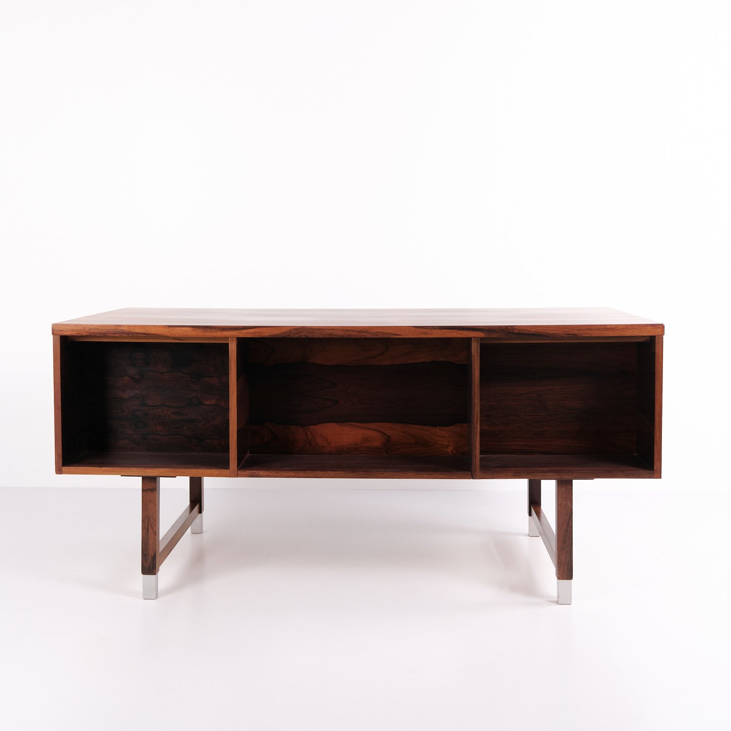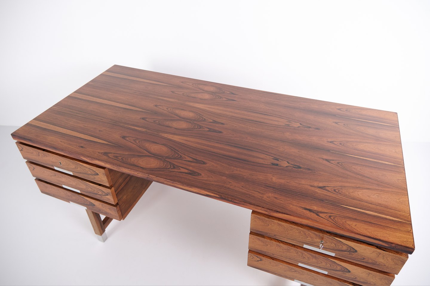 Midcentury skrivebord model EP401 fra Egil Petersens Møbelfabrik, fremstillet i 1960’erne. Udført i palisander med seks skuffer og en åben reol på bagsiden opdelt i tre rum, hvilket gør bordet fuldstændig fritstående. Udstyret med aluminiumsgreb og afslutninger på benene. Bordet fremstår i meget flot stand og er nyligt fuldt poleret. Modellen forveksles ofte med designs af Kai Kristiansen.