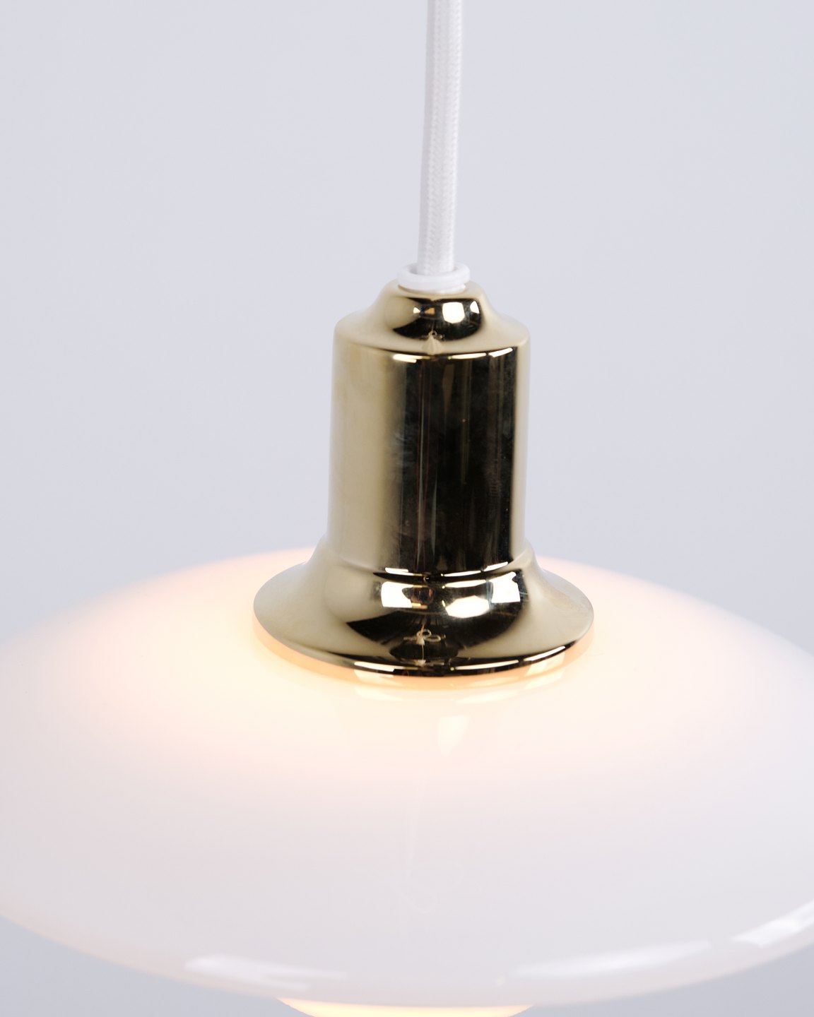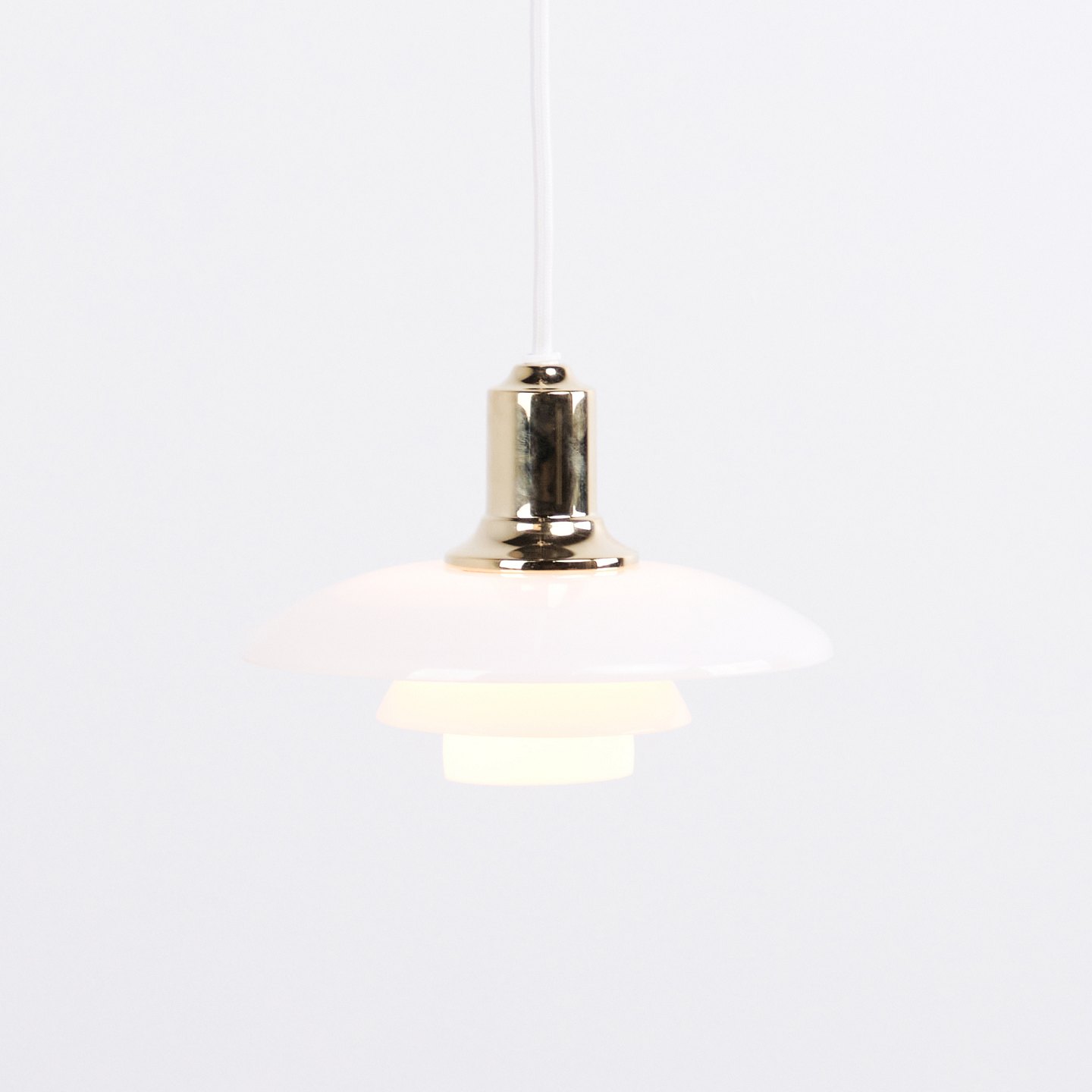 PH 2/1 pendel i messing med opalglas fra Louis Poulsen. Designet af Poul Henningsen med klassisk dansk lysdesign og blændfri belysning.