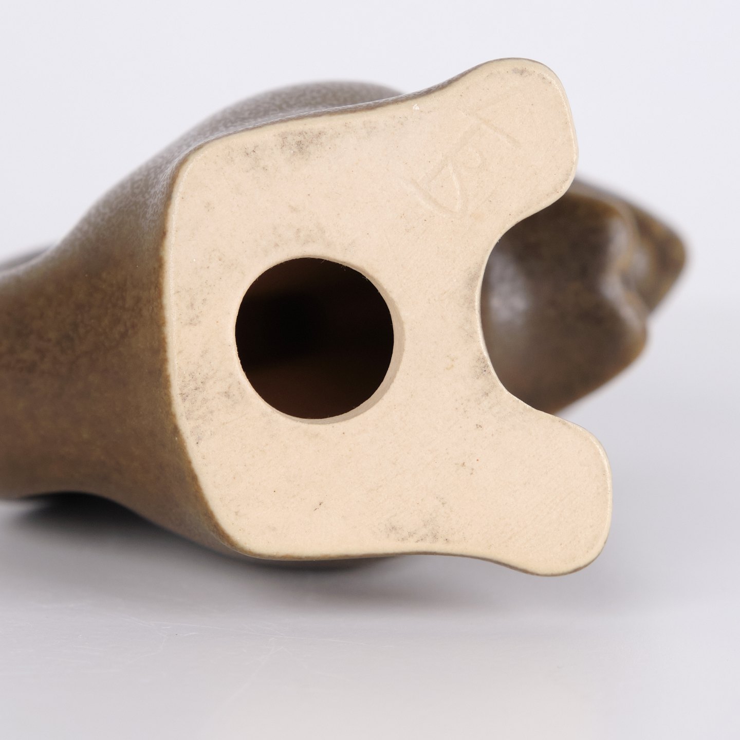 Harefigur af Knud Basse udført i brun glaseret keramik. Modellen viser opret siddende hare med samlet forpoter og markant haleform bagtil. Figuren er dekoreret med lys detalje på fronten og er et klassisk eksempel på Knud Basses populære dyrefigurer fra 1960’erne.