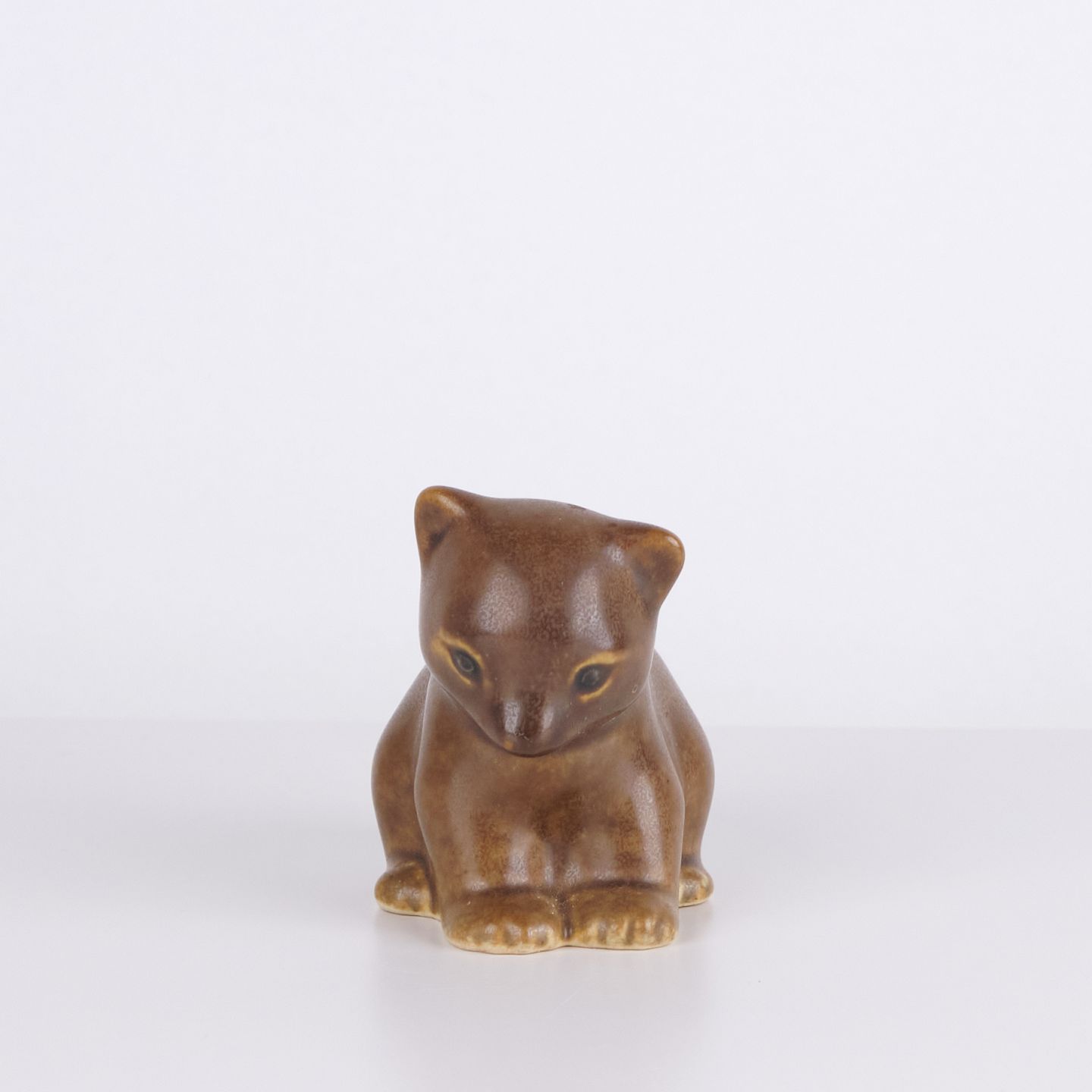 Bjørnefigur af Knud Basse udført i brun glaseret keramik. Figuren viser siddende bjørn med sænket hoved, markerede poter og bløde former. En mindre model fra Knud Basses serie af dyrefigurer, produceret i Danmark i 1960’erne.
