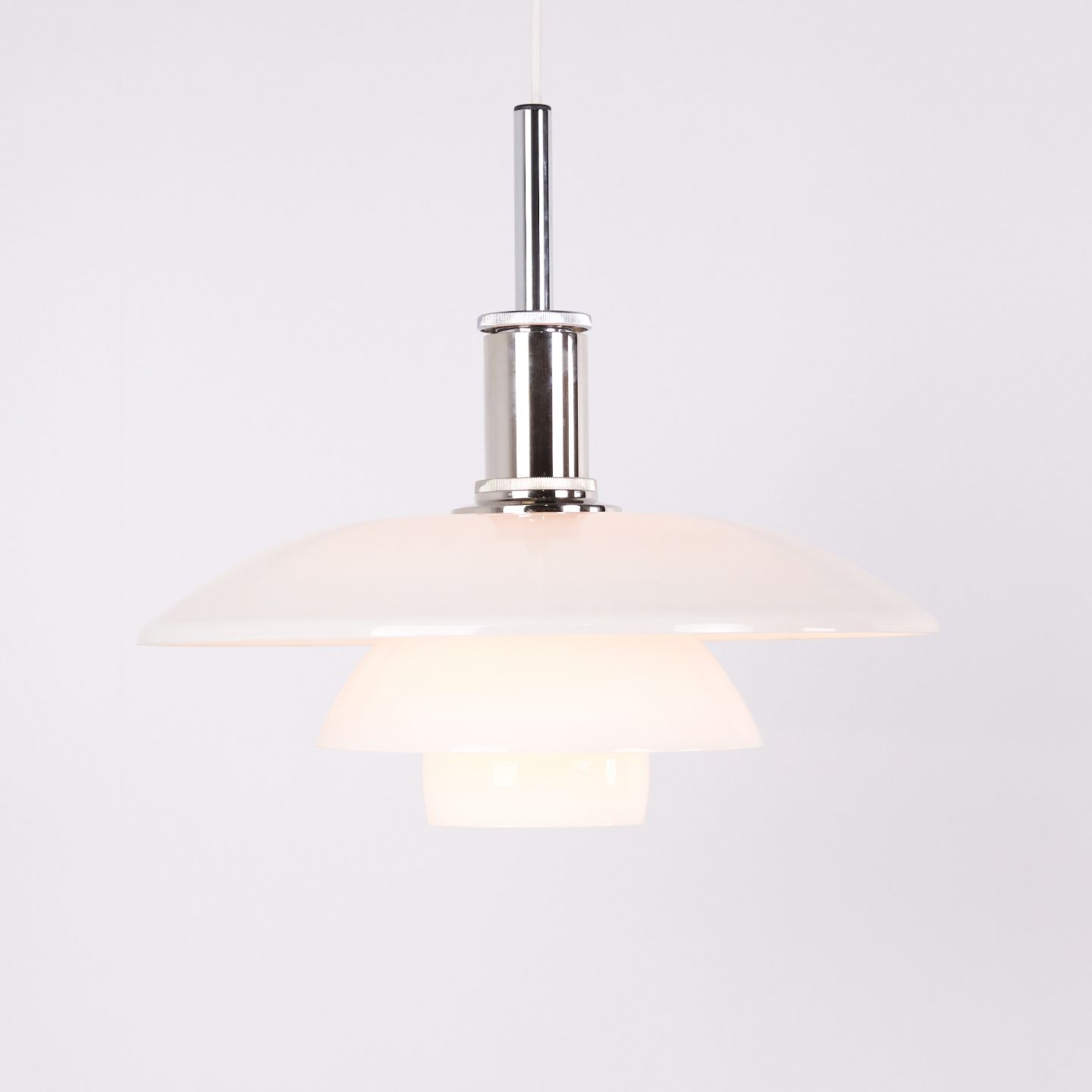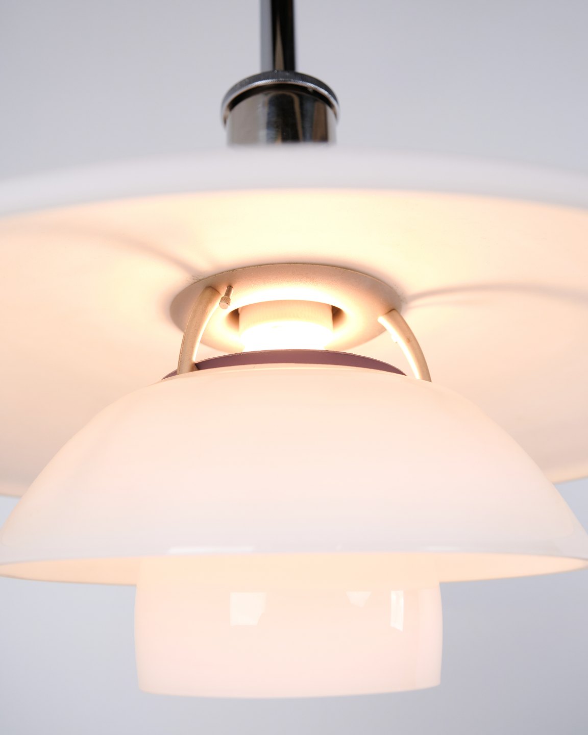 PH 4½-4 pendel designet af Poul Henningsen for Louis Poulsen. Lampen er udført med mundblæste treskærme i hvidt opalglas og kromophæng. Modellen har en overskærm på ca. 45 cm og anvender de nedre skærme fra PH 4/4-serien, udviklet for at give bredere lysfordeling ved lav ophængning over spisebord eller bordflade. Den nuværende version blev introduceret i 1980 og er en del af PH-seriens ikoniske blændfrie belysningssystem.