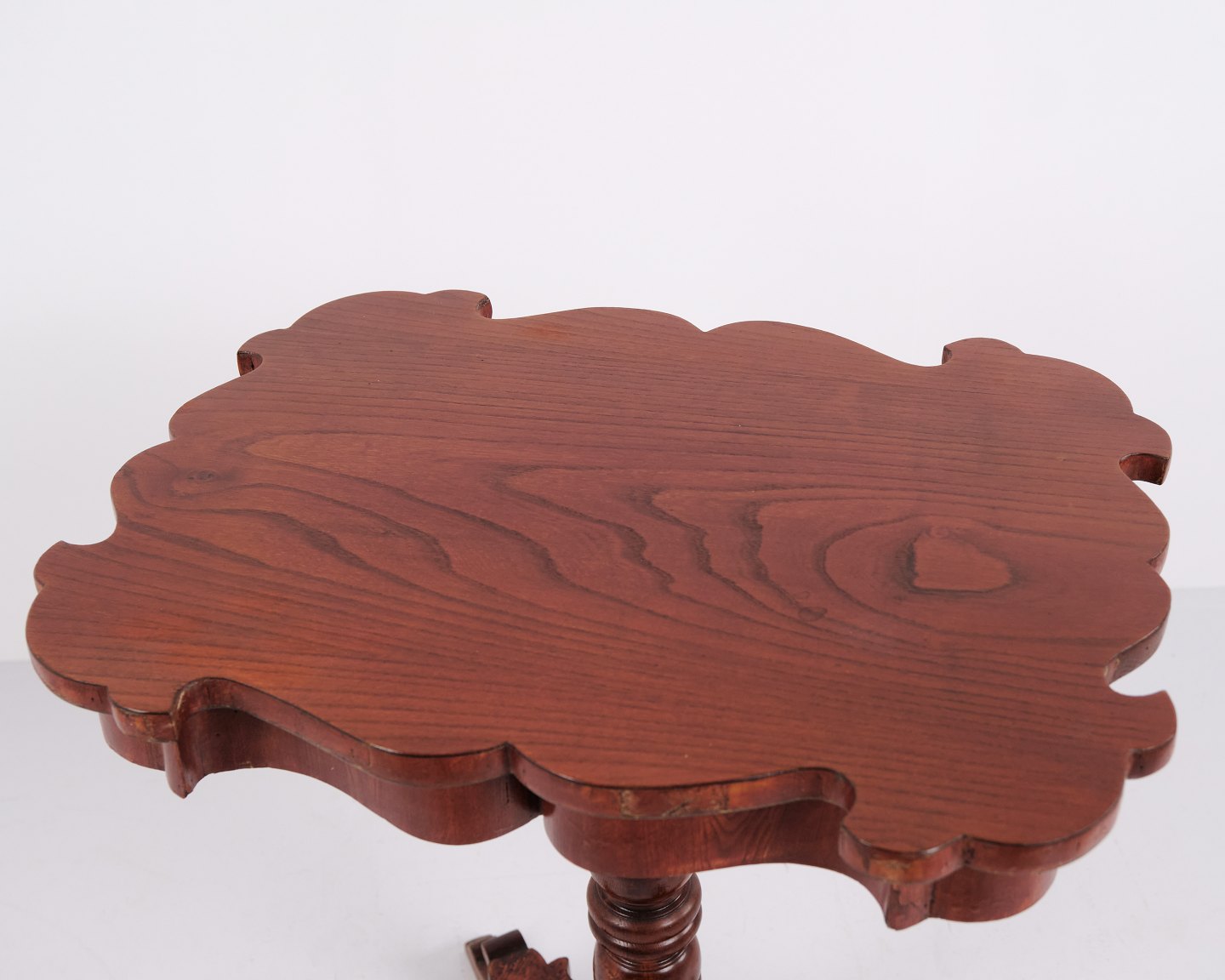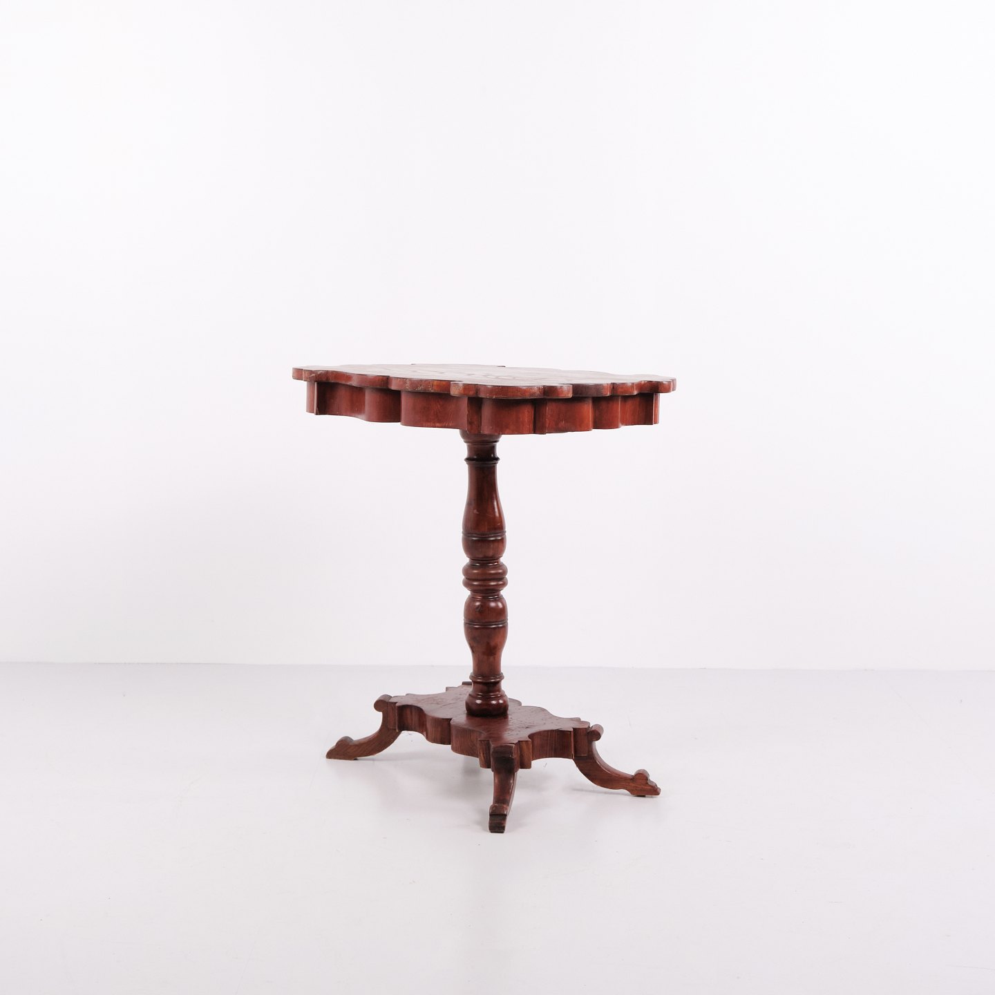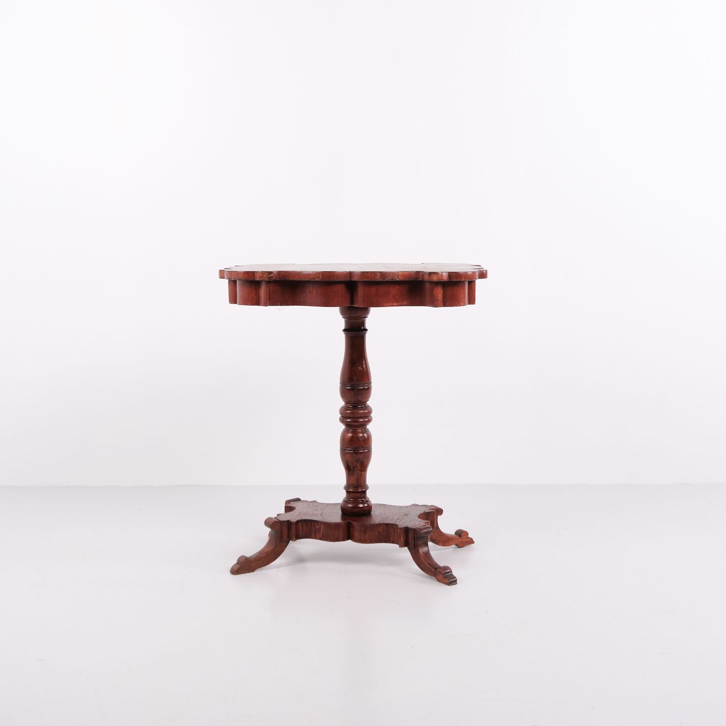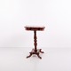 Antikt sidebord udført i mahogni med rektangulær profileret plade, drejet søjlefod og fire svungne ben. Bordet har klassiske proportioner og detaljer typiske for europæiske salon- og sideborde fra 1800-tallet. Velegnet som lampebord, konsolbord eller mindre entrébord. Mahogni var et foretrukket materiale i perioden på grund af styrke, glød og flot åretegning.