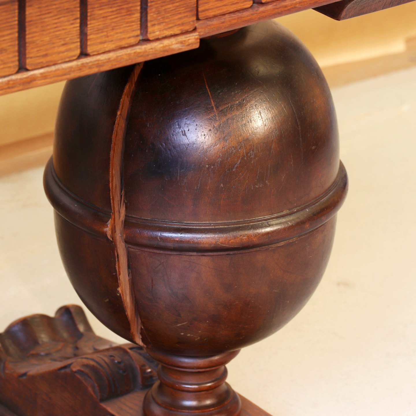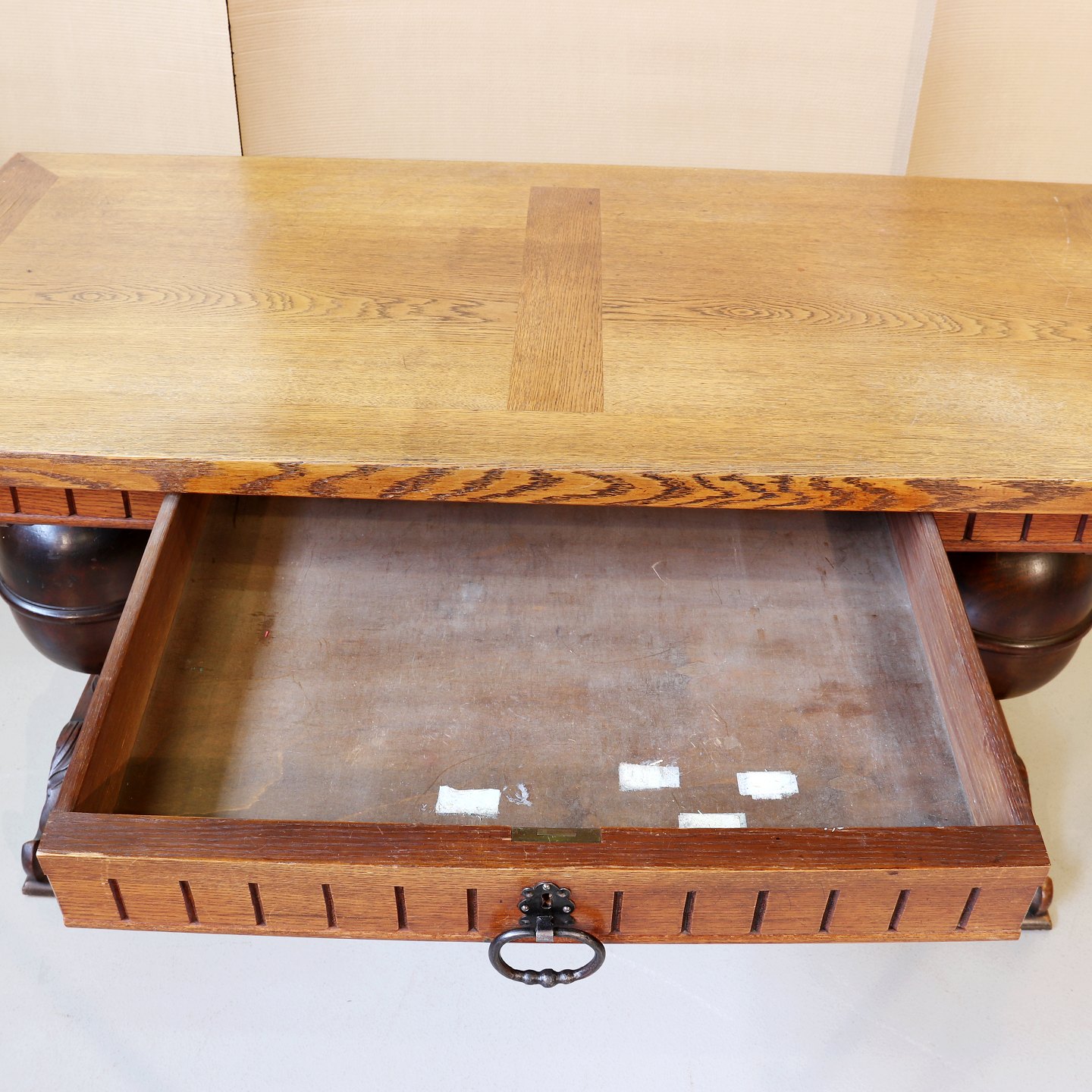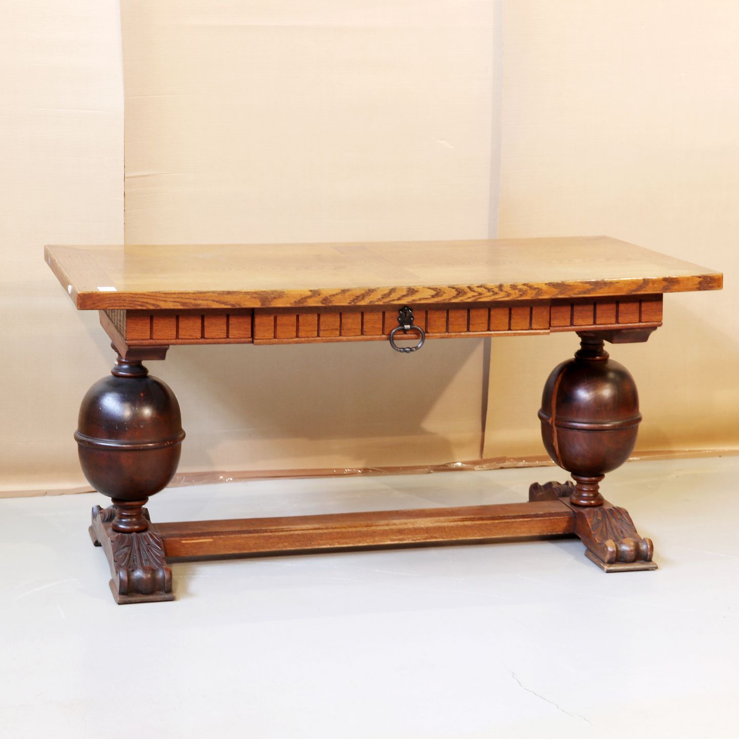 Skrivebord i bejdset, fineret og lakeret egetræ m. skuffe, i renæssancestil, OBS den ene kugle er revnet, fra 1930erne. Højde 78cm Bredde 160cm Dybde 80cm Emne nummer: 42709