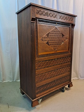 Linnedskab i fineret mahogni, fra 1900erne. Det har brugsspor og mangler lister på siden og lågen. Højde 157cm Bredde 74cm Dybde 45cm Emne nummer: 90954