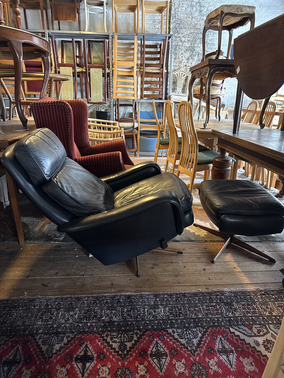 Læder lænestol med fodskammel, fra 1990erne. Den har brugsspor og vippe funktion. Ryghøjde 94cm Sædehøjde 40cm Bredde 82cm Dybde 84cm Emne nummer: 76454