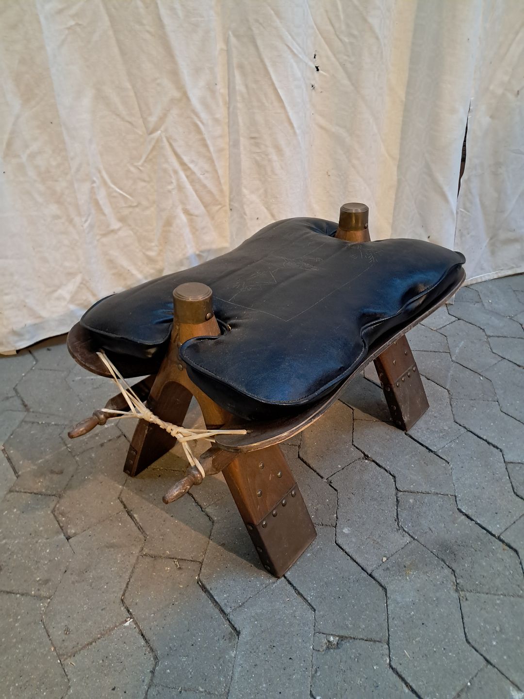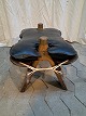 Skammel i massivt træ med kunstlæder hynde, fra 1980erne. Den har brugsspor. Højde 38cm Bredde 40cm Længde 61cm Emne nummer: 91924