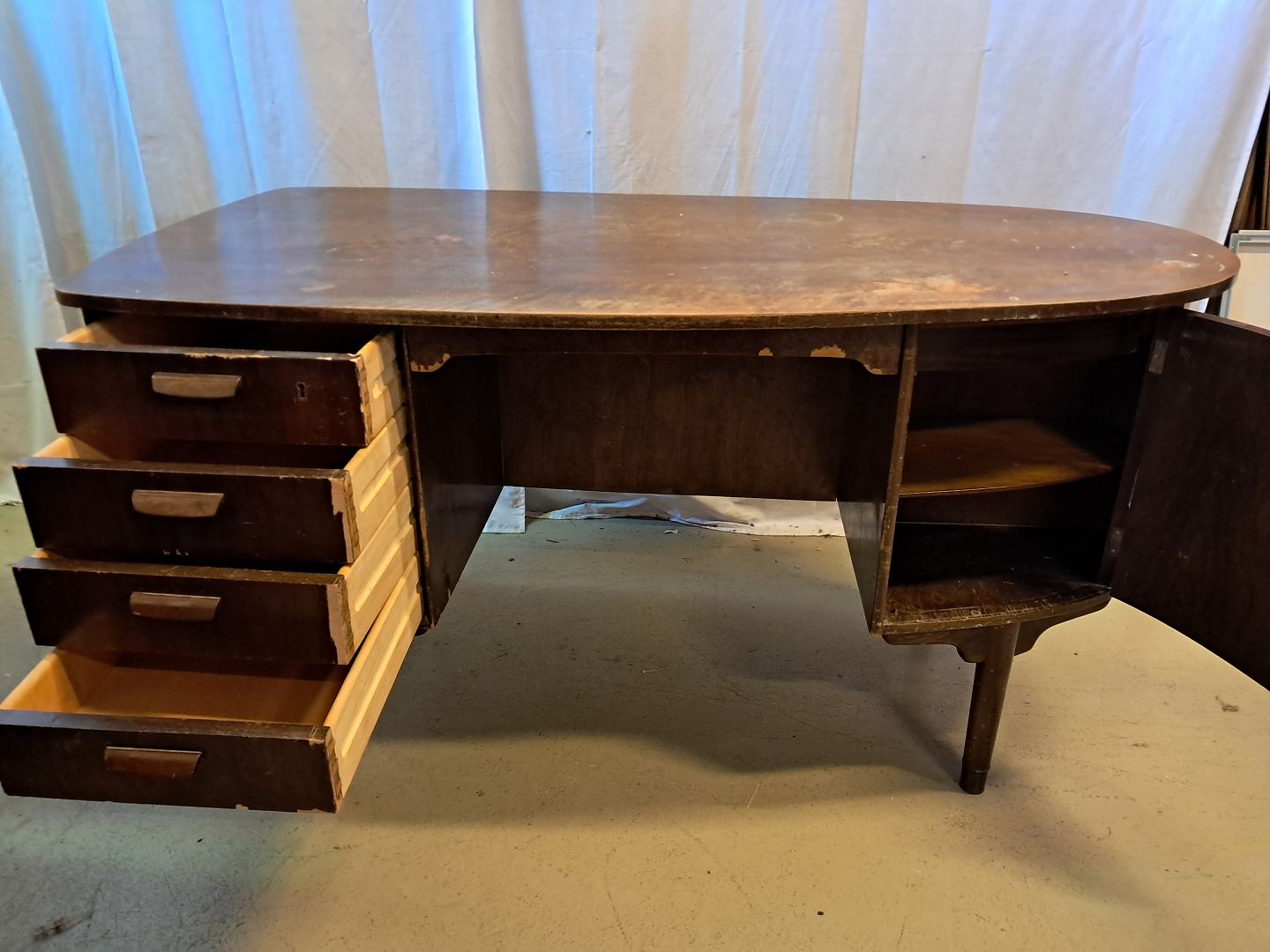 Skrivebord i fineret nødetræ, fra 1960erne. Den har brugsspor. Højde 72cm Bredde 140cm Dybde 66cm Højde fra gulv til underkant 66cm Emne nummer: 77219