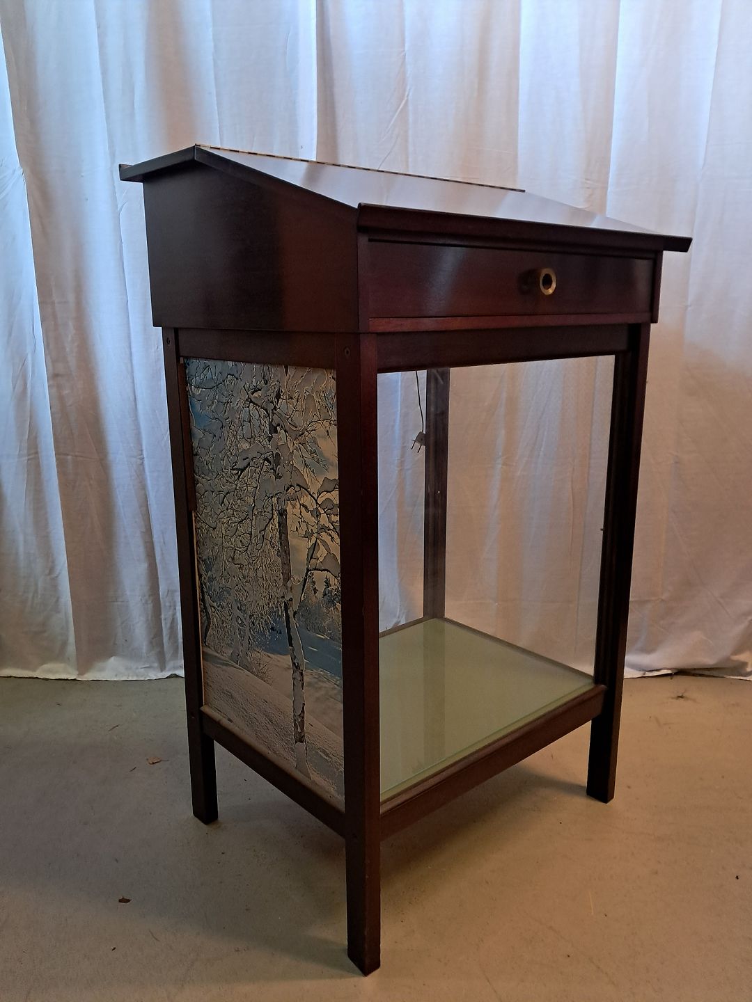 Skrivepult i fineret mahogni og glas, fra 1980erne. Den har brugsspor. Højde 115cm Bredde 70cm Dybde 58cm Emne nummer: 77221