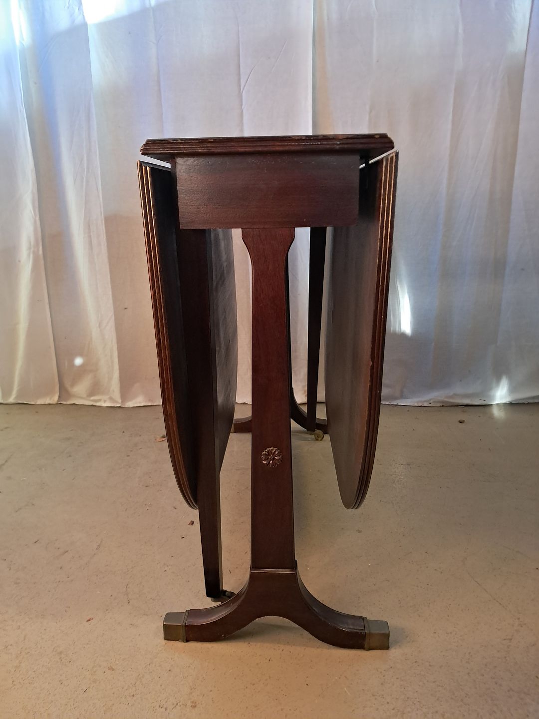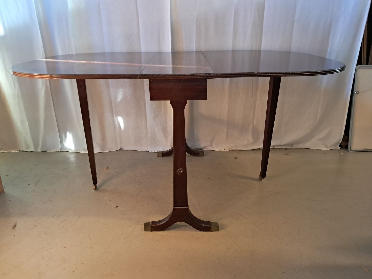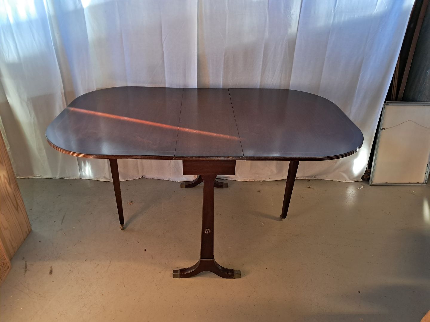 Kaptajnens bord i fineret mahogni, fra 1970erne. Det har små brugsspor. Højde 75cm Bredde 92cm Længde 29cm Længde med klapper 150cm Emne nummer: 77222