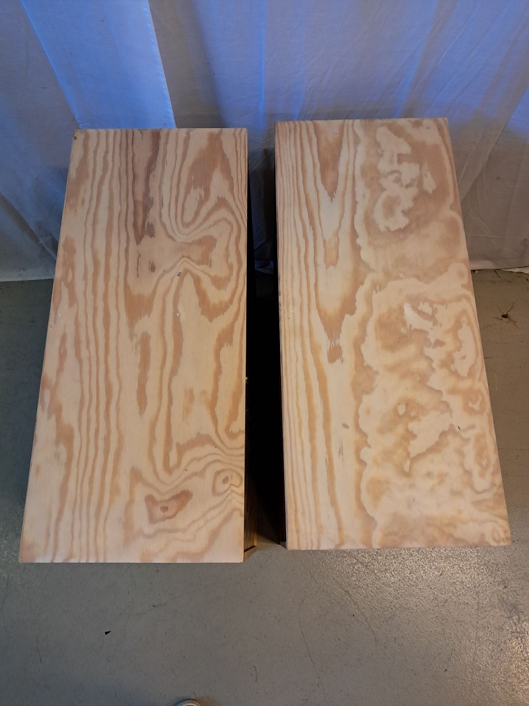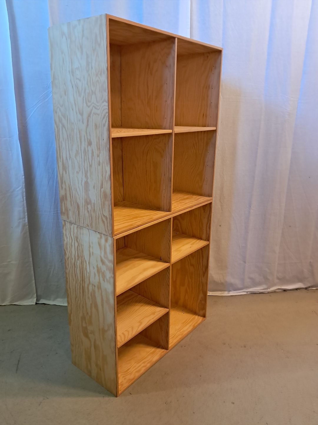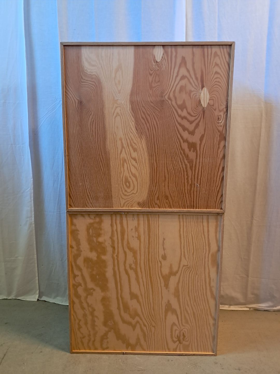2 Reolkasser i krydsfiner, fra 2000erne. De har brugsspor og der medfølger ikke ophæng. Højde 70cm Bredde 70cm Dybde 30cm Emne nummer: 77244