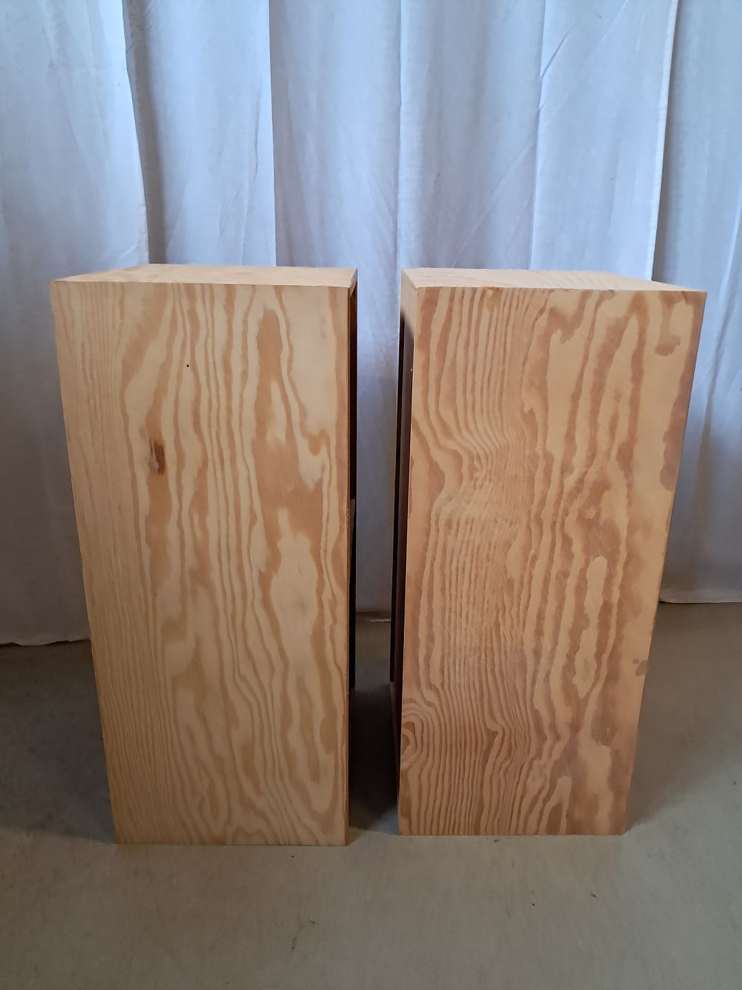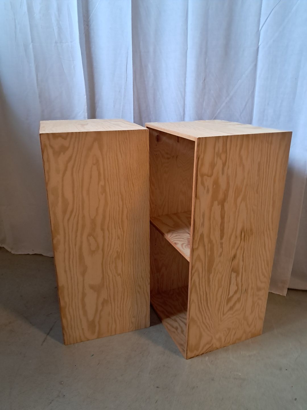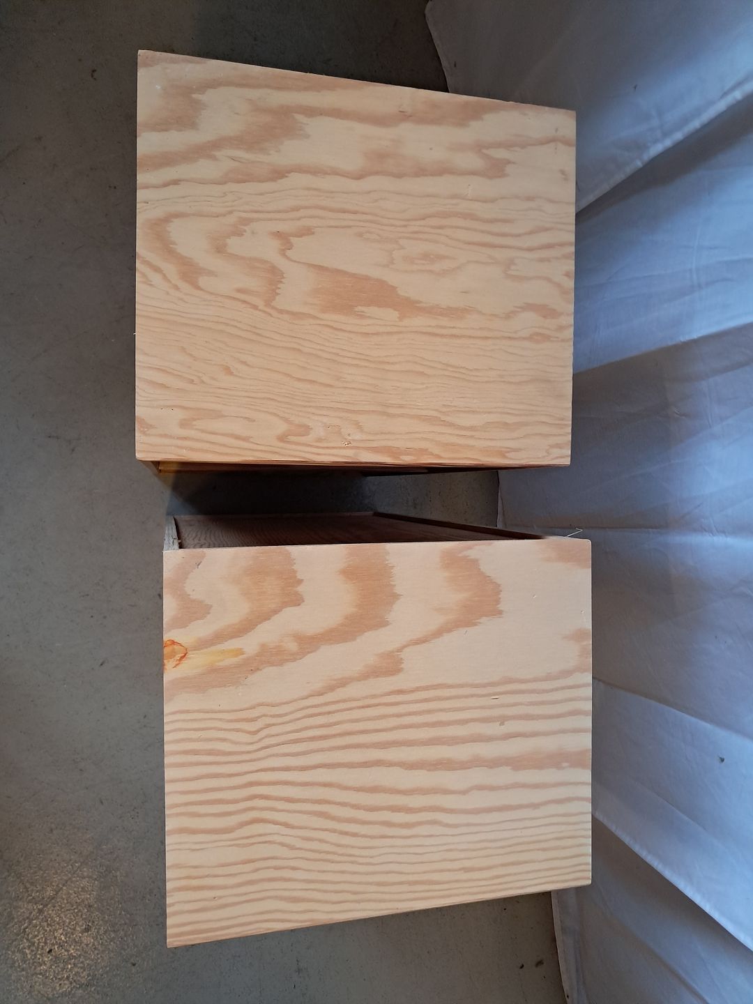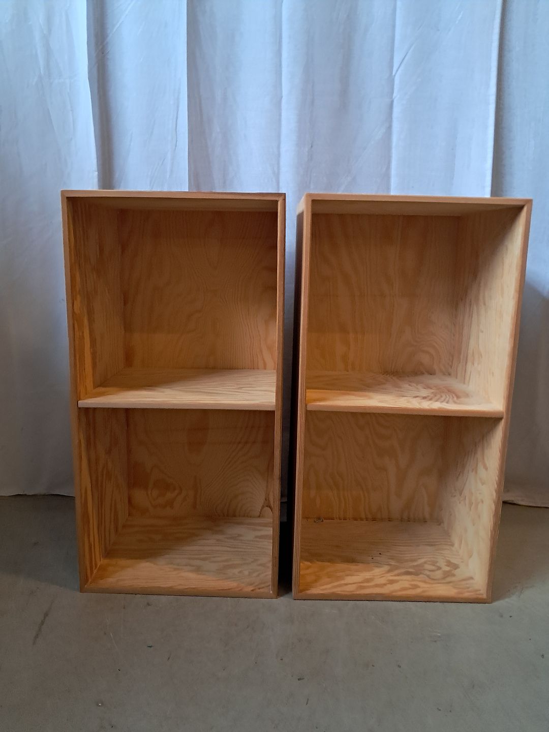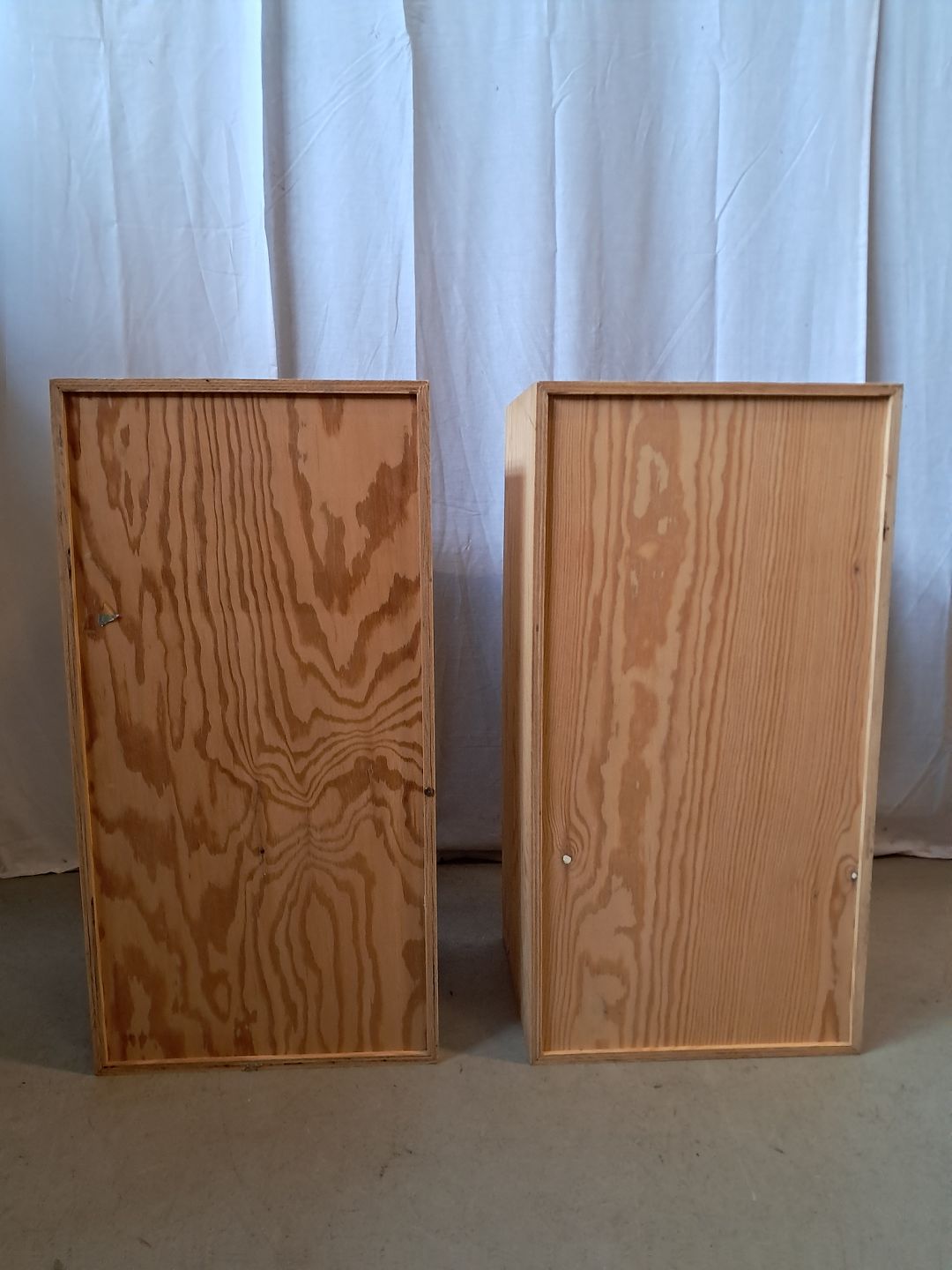 2 Reolkasser i krydsfiner, fra 2000erne. De har brugsspor og der medfølger ikke ophæng. Højde 70cm Bredde 35,5cm Dybde 30cm Emne nummer: 77255