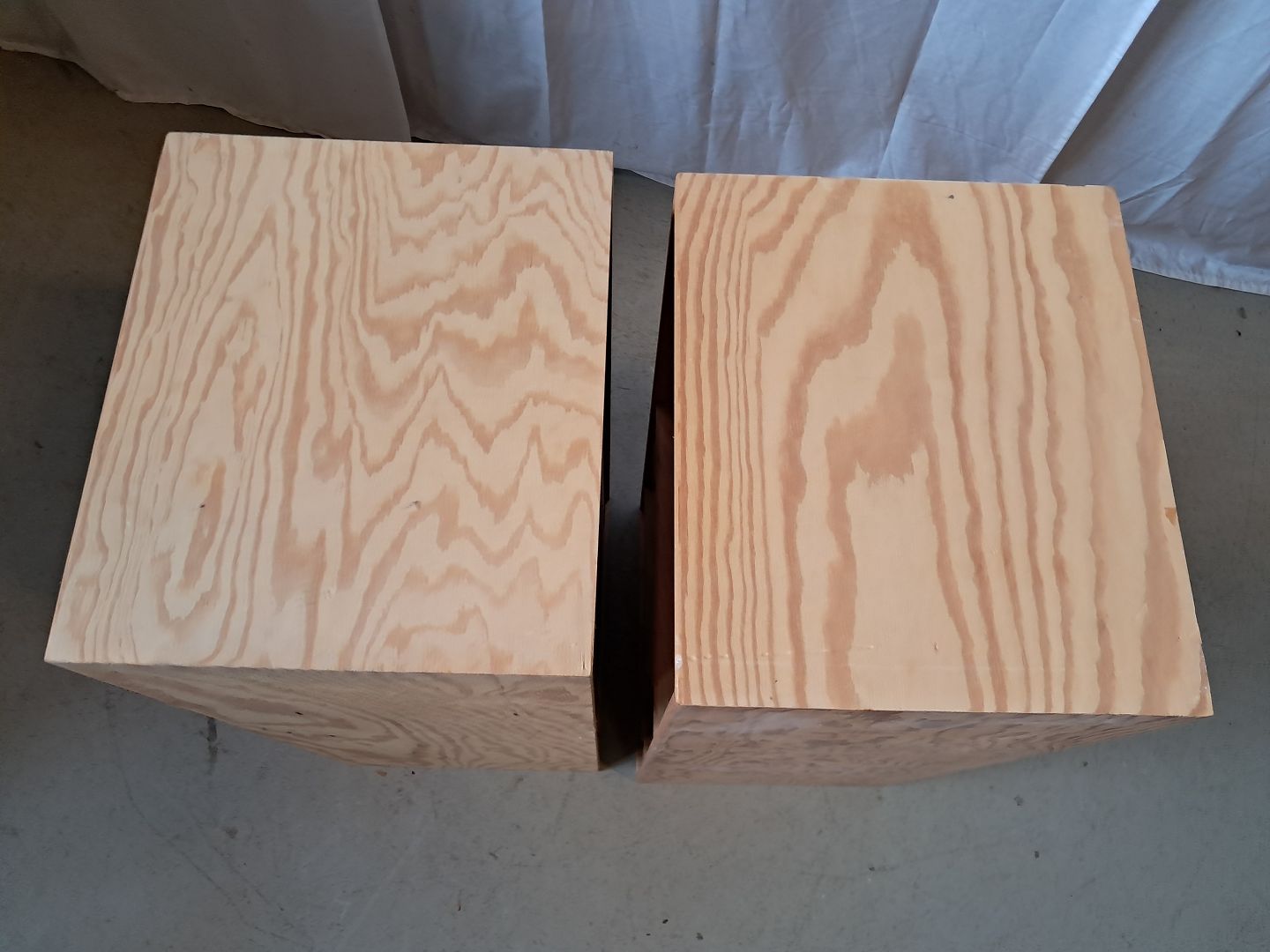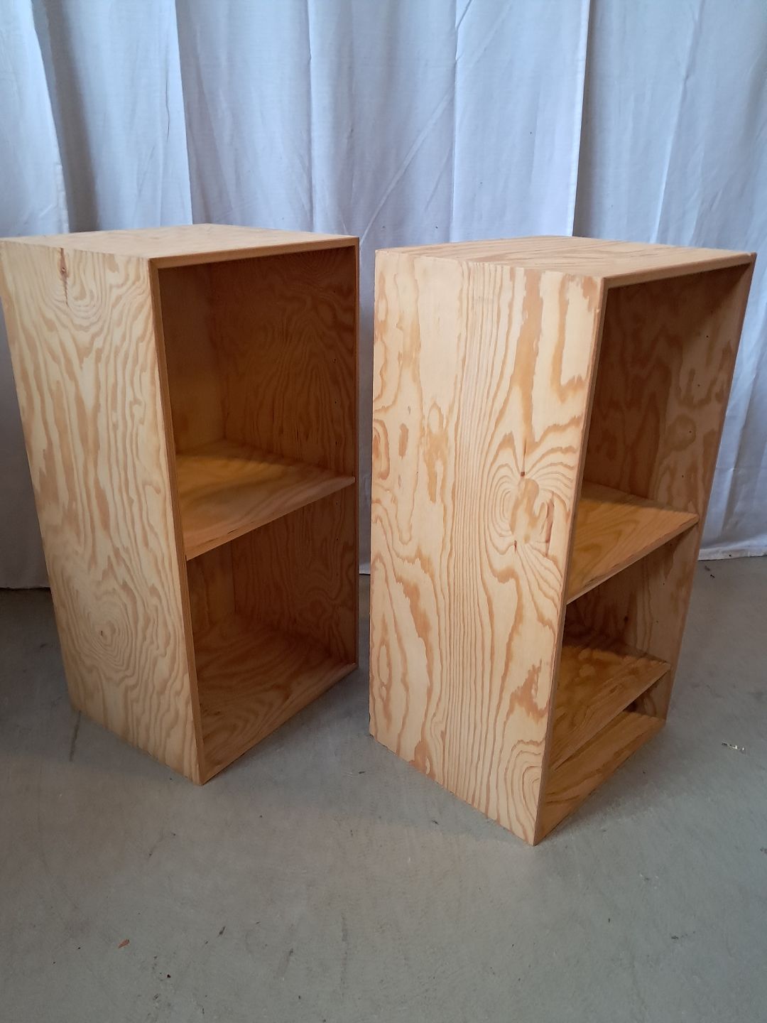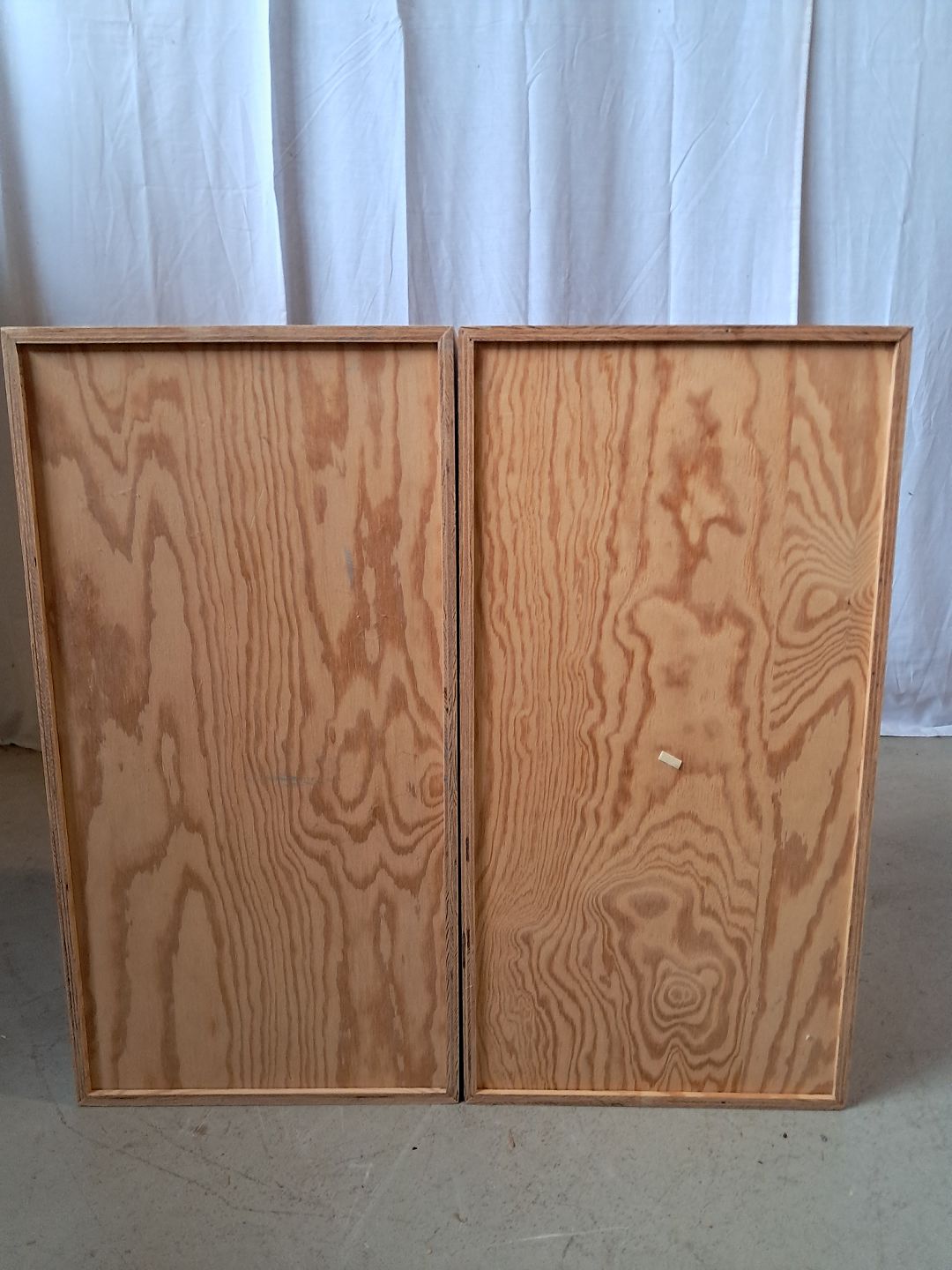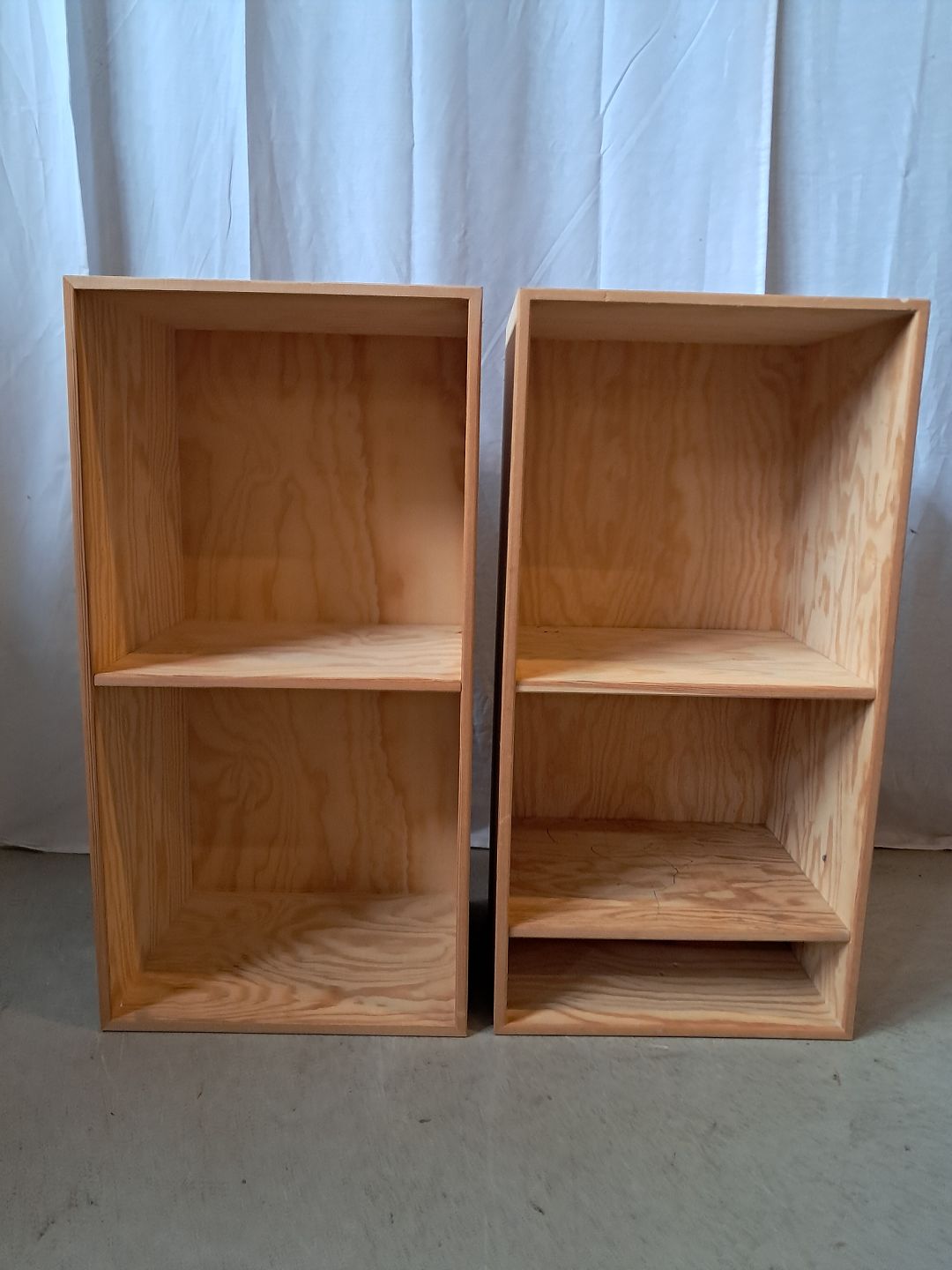 2 Reolkasser i krydsfiner, fra 2000erne. De har brugsspor og der medfølger ikke ophæng. Højde 70cm Bredde 35,5cm Dybde 30cm Emne nummer: 77257