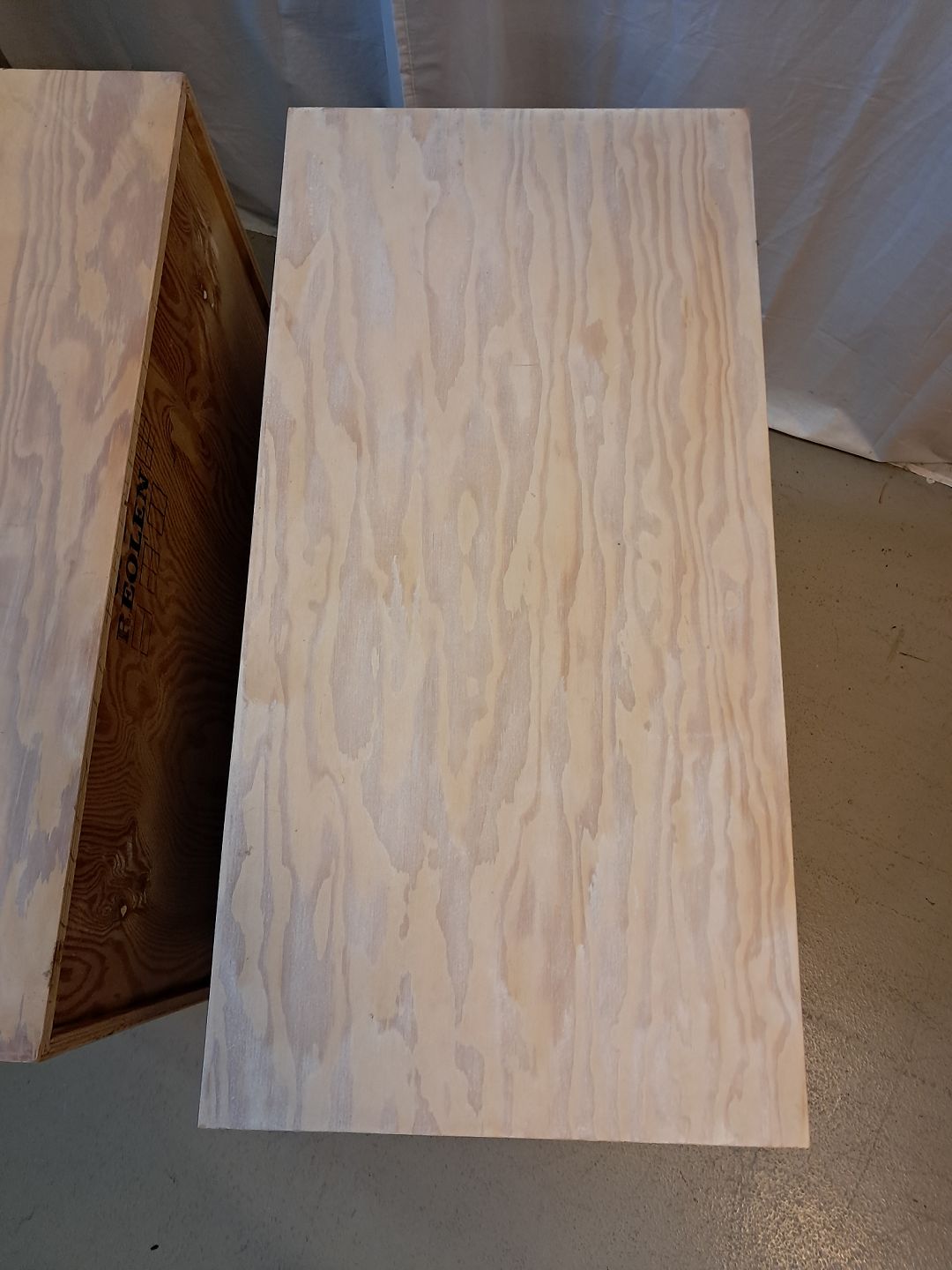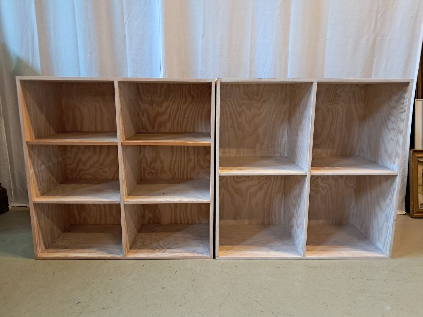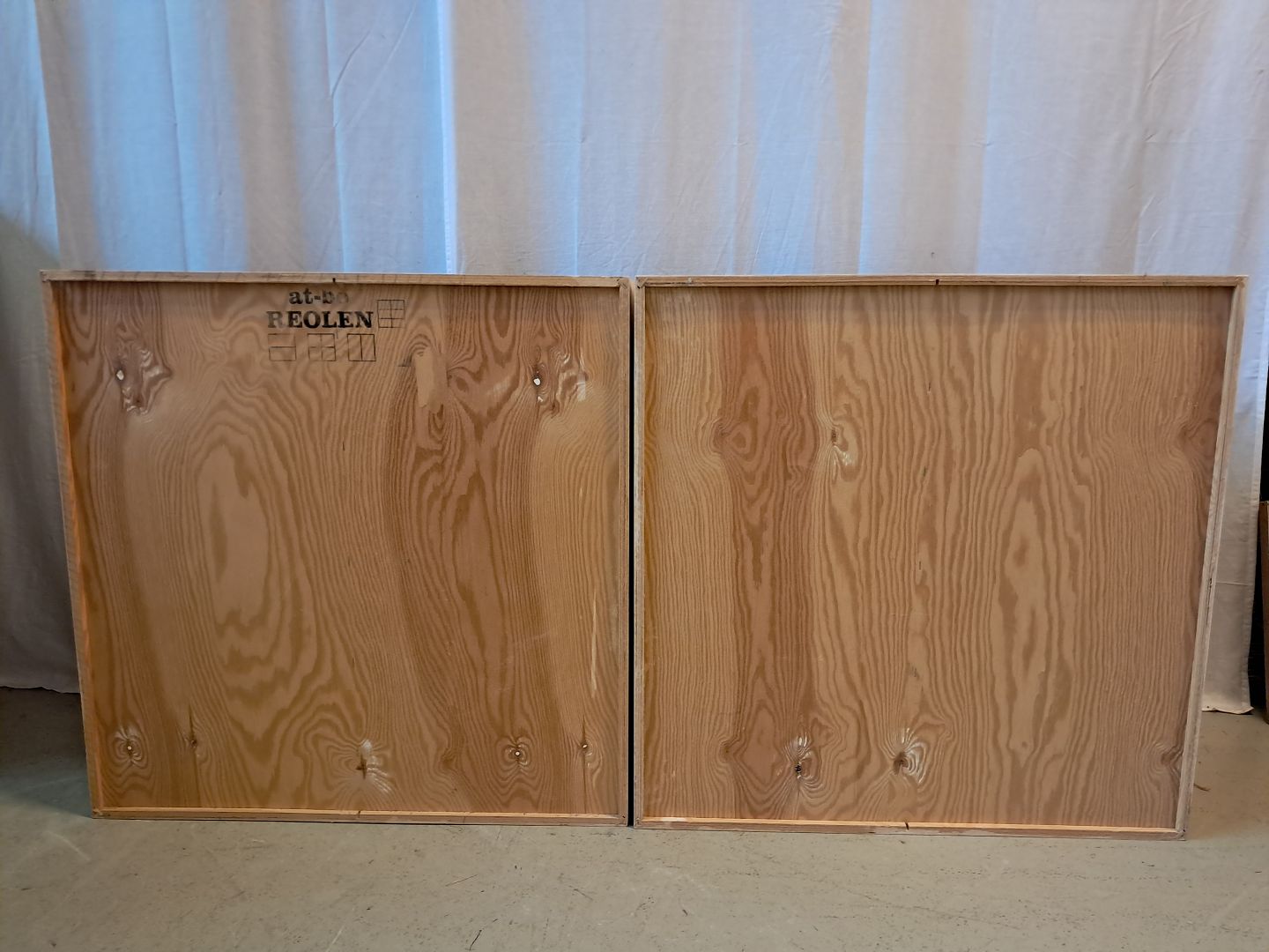 2 At-Bo reolkasser i krydsfiner, fra 2000erne. De har brugsspor og der medfølger ikke ophæng. Højde 70cm Bredde 70cm Dybde 34cm Emne nummer: 77284