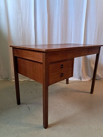 Stort Skrivebord fra 1980'erne i eg og aluminium. Fremstår pænt, velholdt og udmærket funktionsdygtigt. Dog med meget let afblegning på bordpladen efter en skrivemåtte. (Ses på billede) Højde 74 cm. Bredde 120 cm. Dybde 45 cm Emne nummer: 60666