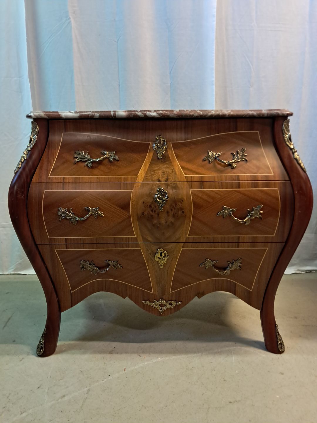 Kommode i fineret mahogni med marmorplade, fra 1980erne. Den har brugsspor. Højde 74cm Bredde 85cm Dybde 42cm Emne nummer: 77295