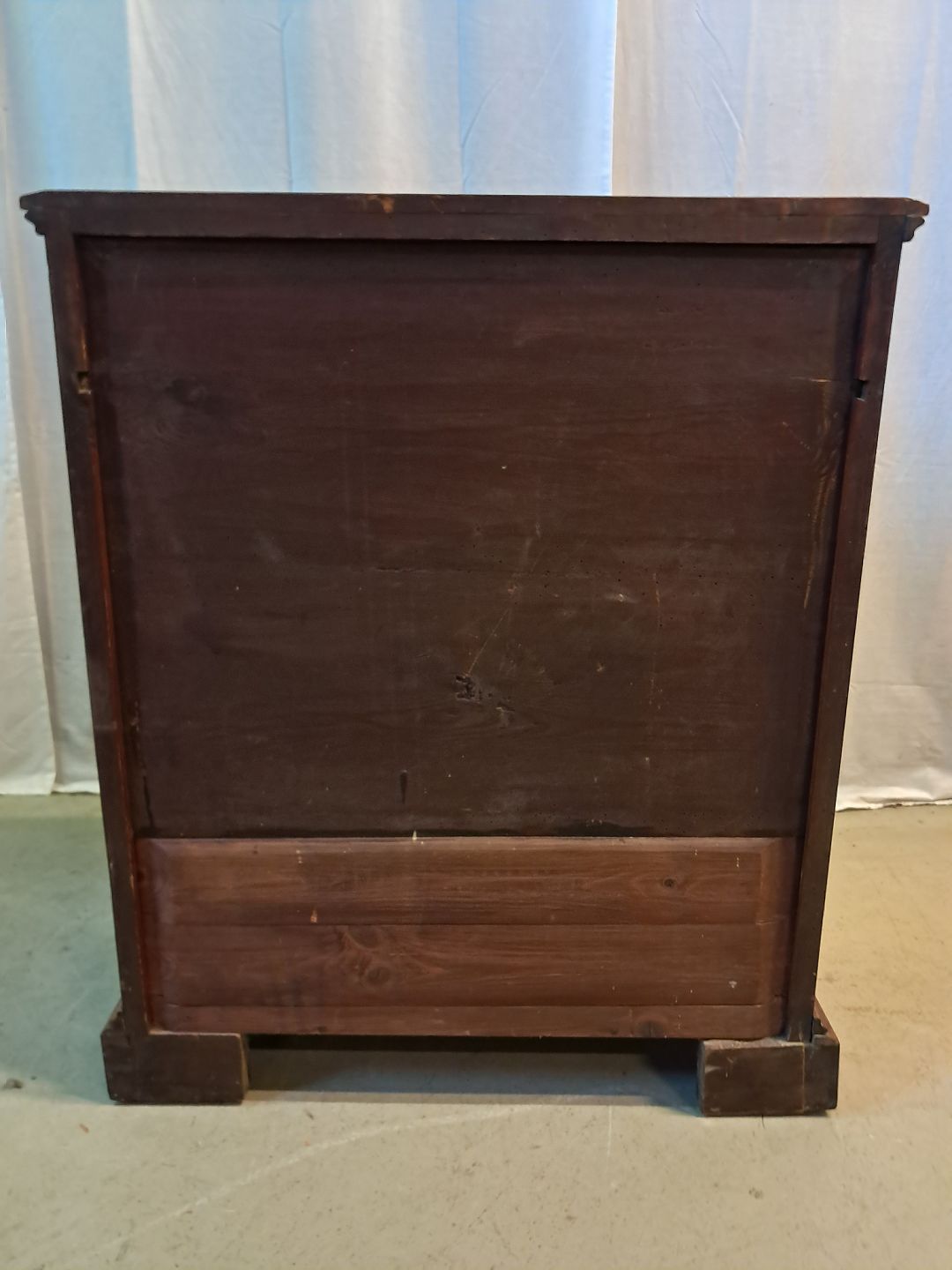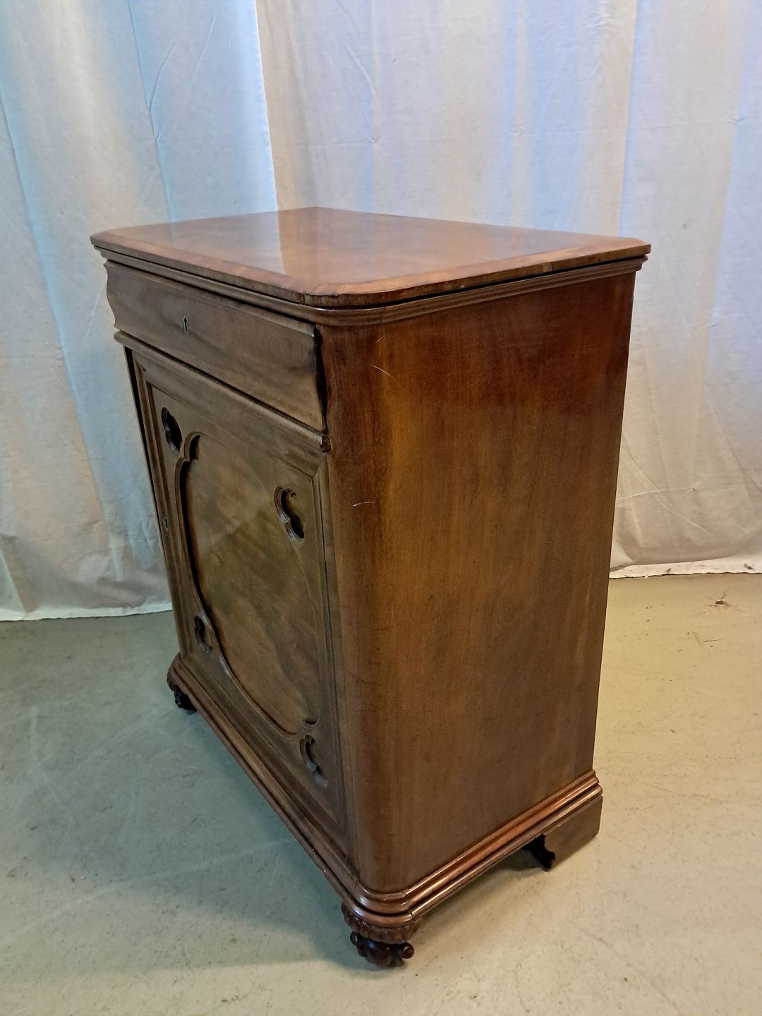 Skab i fineret mahogni, fra 1900erne. Det har brugsspor. Højde 84cm Bredde 69cm Dybde 39cm Emne nummer: 77297