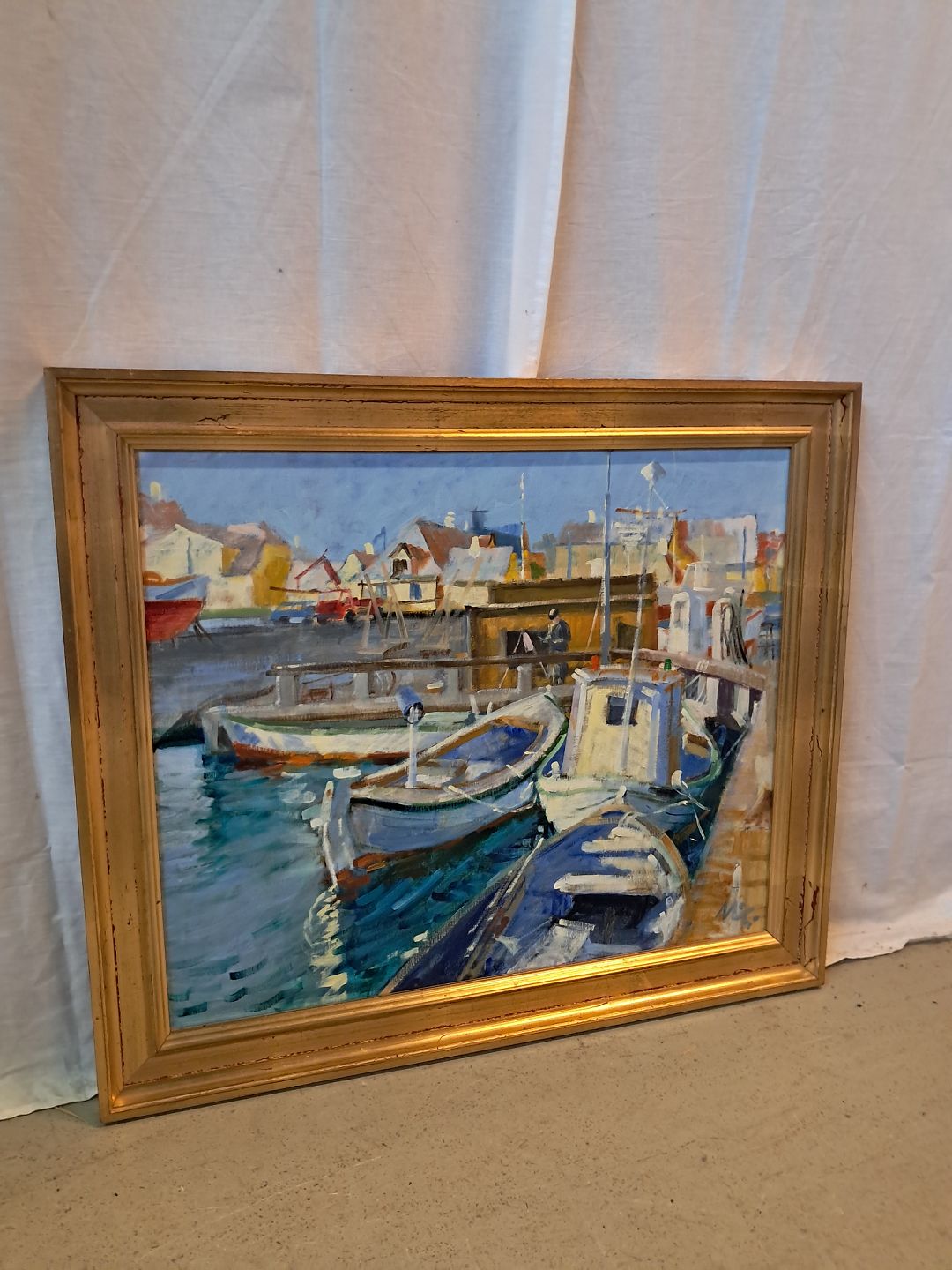 Maleri af Dragør havn i guldmalet ramme, af : Mogens Amdi Thorsen (1924-2016) Det har brugsspor. Højde 60cm Bredde 71cm Emne nummer: 77327