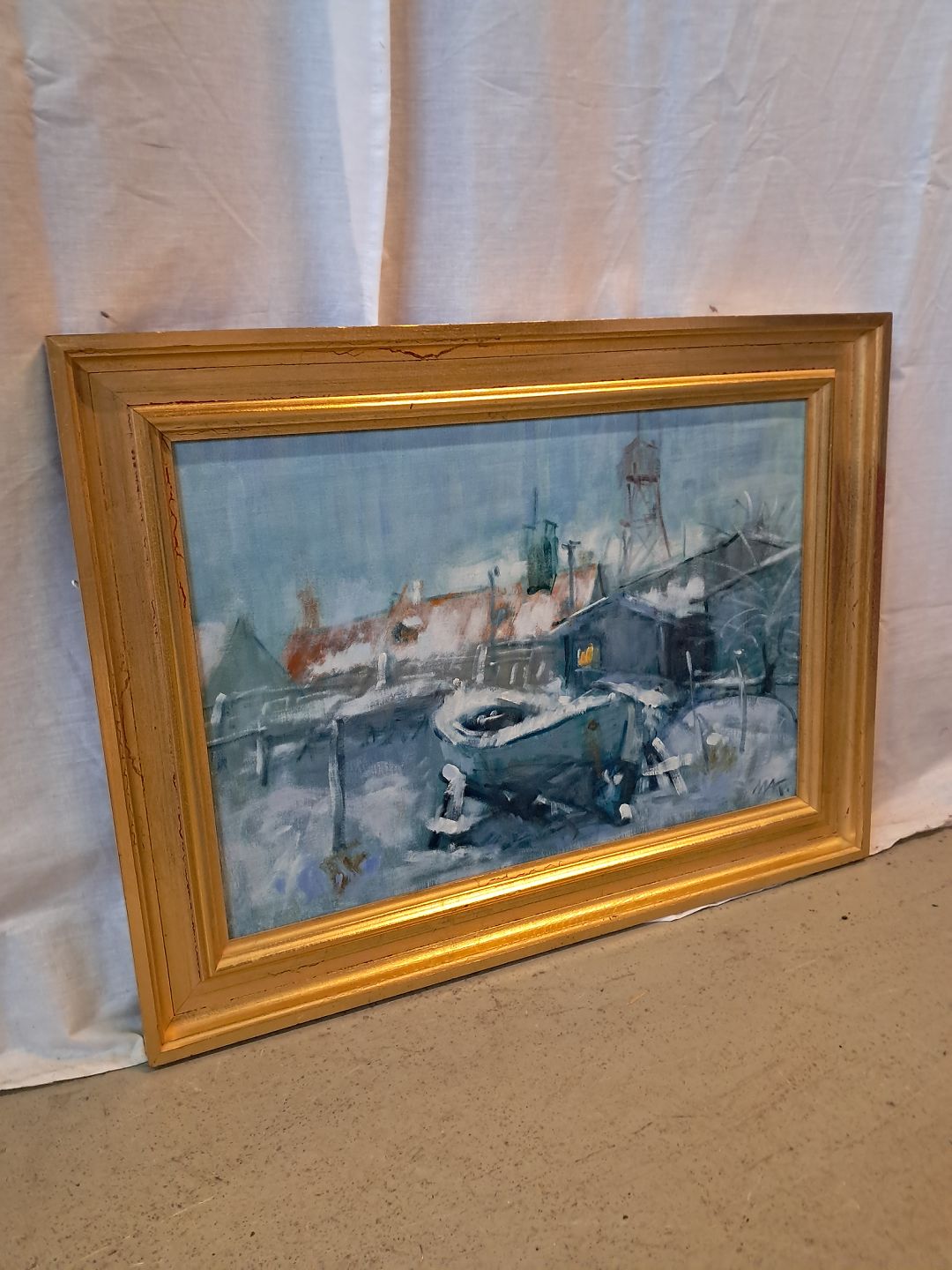 Maleri af Dragør Havn i guldmalet ramme, af : Mogens Amdi Thorsen (1924-2016) Det har brugsspor. Højde 46cm Bredde 61cm Emne nummer: 77330