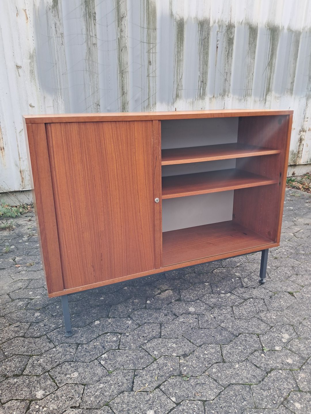 Jalousi skab i fineret teaktræ, fra 1970erne. Det har brugsspor og der medfølger ikke nøgle. Højde 93cm Bredde 120cm Dybde 43cm Emne nummer: 77345