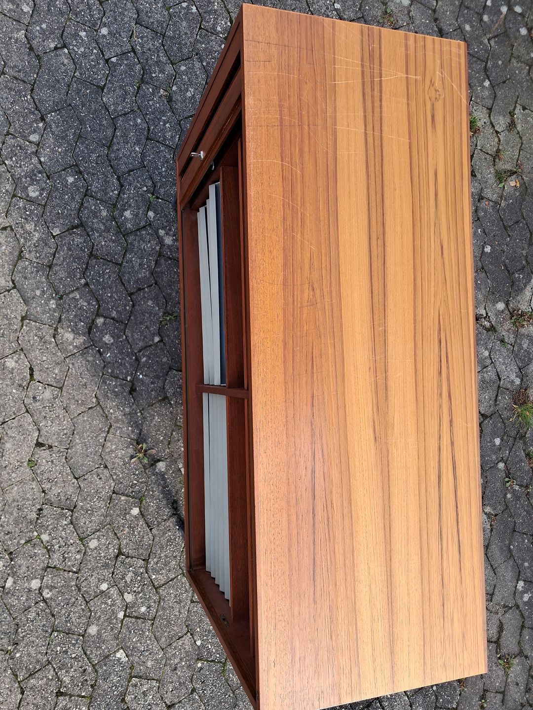 Jalousi skab i fineret teaktræ, fra 1970erne. Det har brugsspor og der medfølger en nøgle. Højde 93cm Bredde 120cm Dybde 43cm Emne nummer: 77346