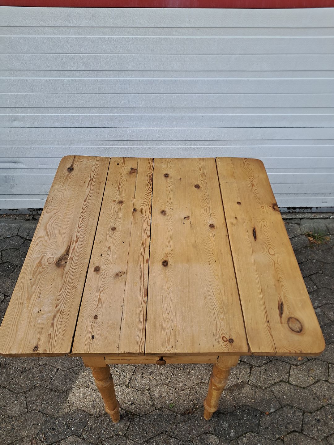 Bord i massivt fyrretræ med klapper og skuffe, fra 1920erne. Det har brugsspor. Højde 78cm Bredde 52cm Bredde med klapper 91cm Længde 94cm Emne nummer: 77350