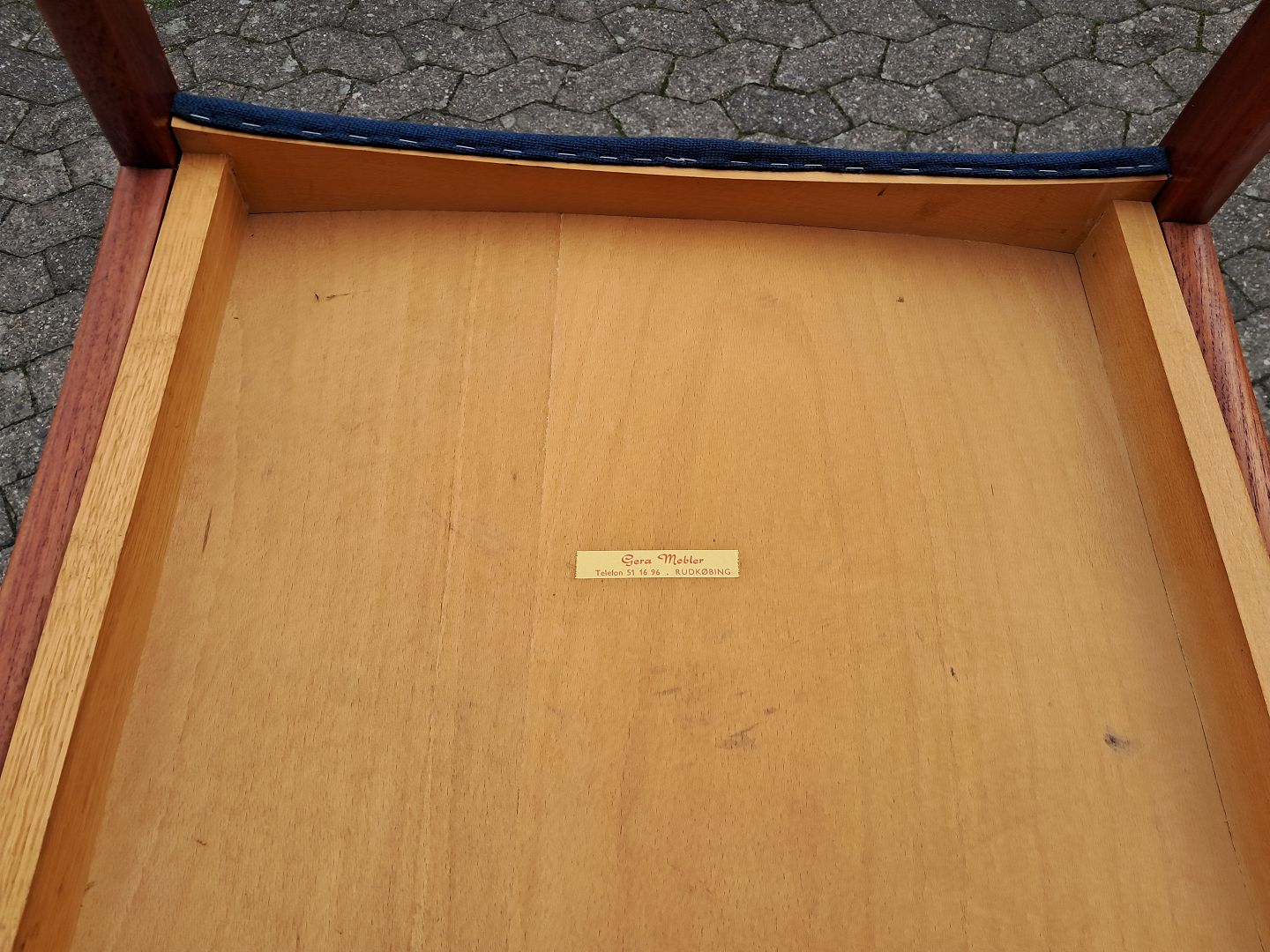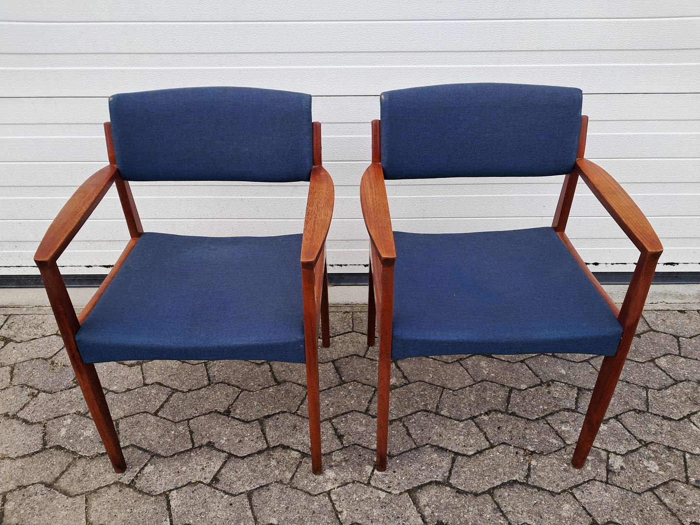 2 Armstole i massivt teaktræ, fra 1960erne. De har brugsspor og defekt betræk. Ryghøjde 78cm Sædehøjde 44cm Emne nummer: 77387