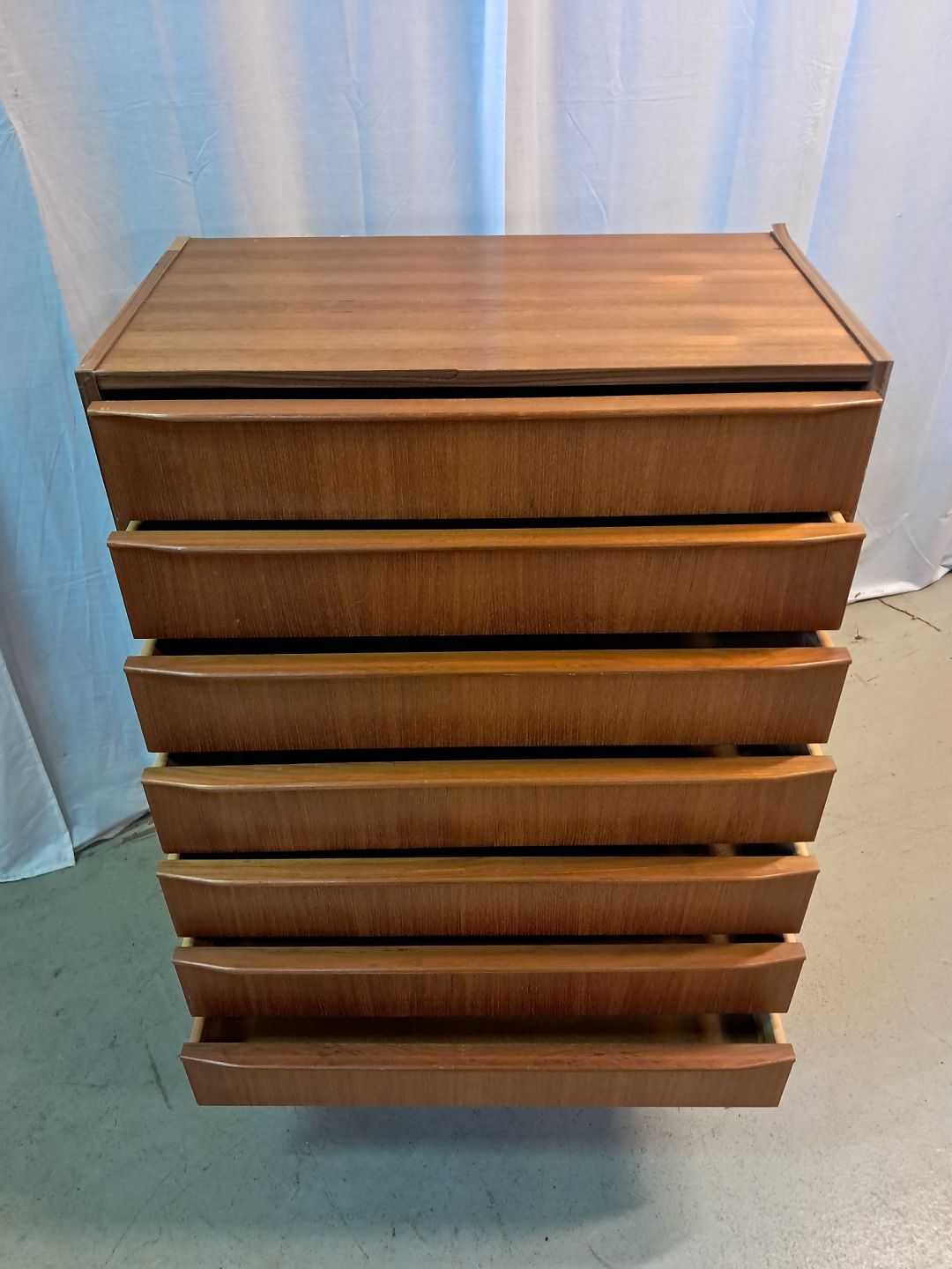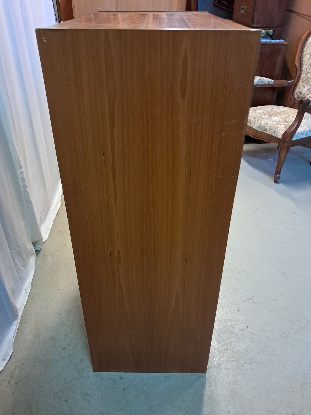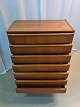 Kommode i fineret teaktræ, fra 1960erne. Den har brugsspor og defekte plast kantlister/bånd. Højde 110cm Bredde 76cm Dybde 41cm Emne nummer: 77407