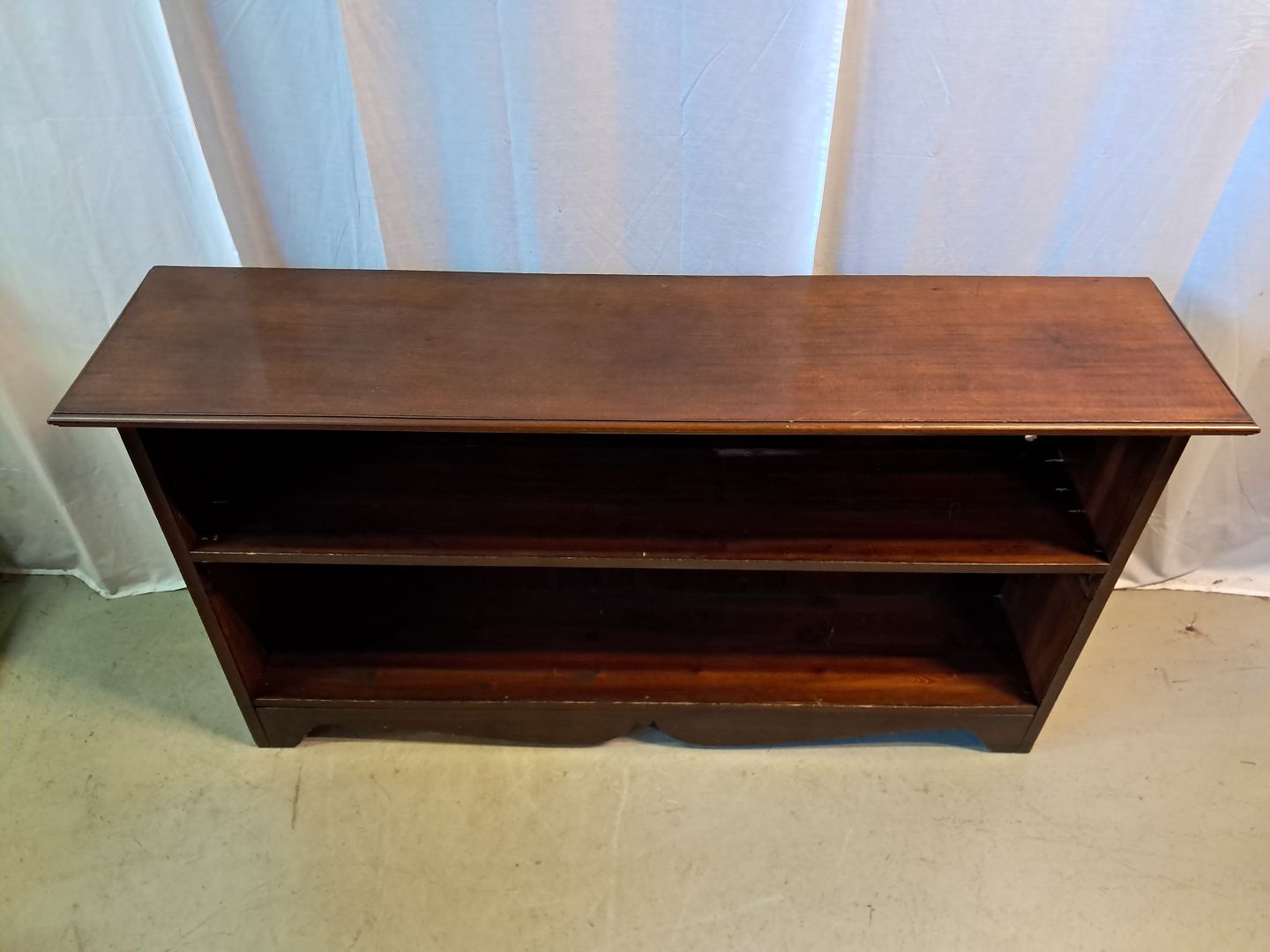 Reol i fineret mahogni, fra 1910erne. Den har brugsspor. Højde 80cm Bredde 148cm Dybde 35cm Emne nummer: 77450
