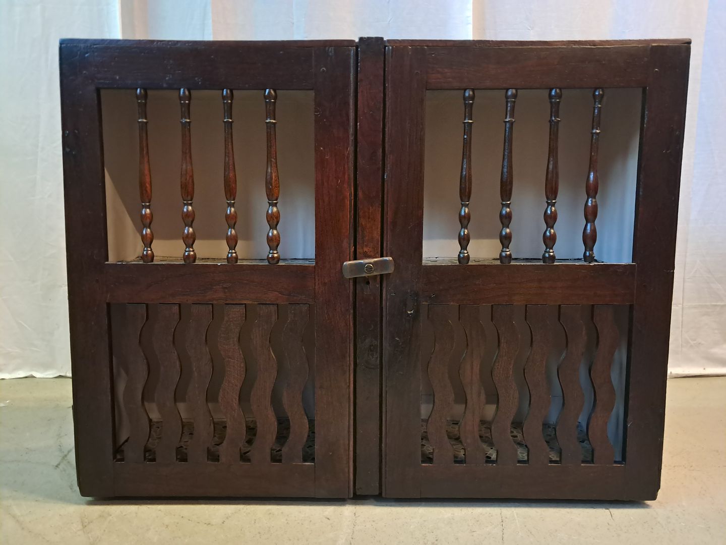 Antikt skab i massivt egetræ, fra 1880erne. Det har brugsspor. Højde 72cm Bredde 92cm Dybde 28cm Emne nummer: 77457