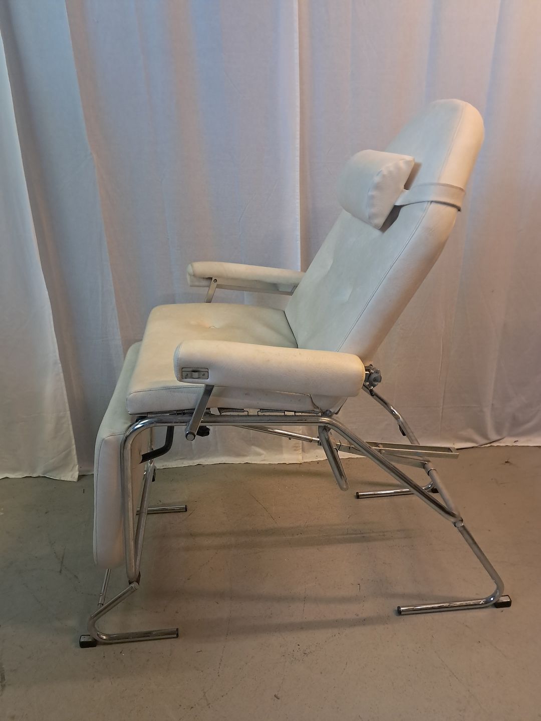 Massagse-stol og briks i metal og kunstlæder, fra 1990erne. Den har brugsspor. Højde 80cm Bredde 75cm Længde 165cm Emne nummer: 77462