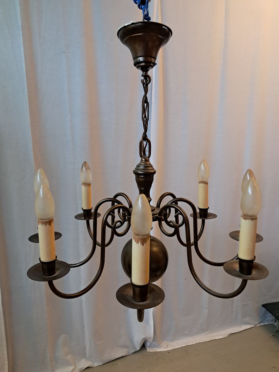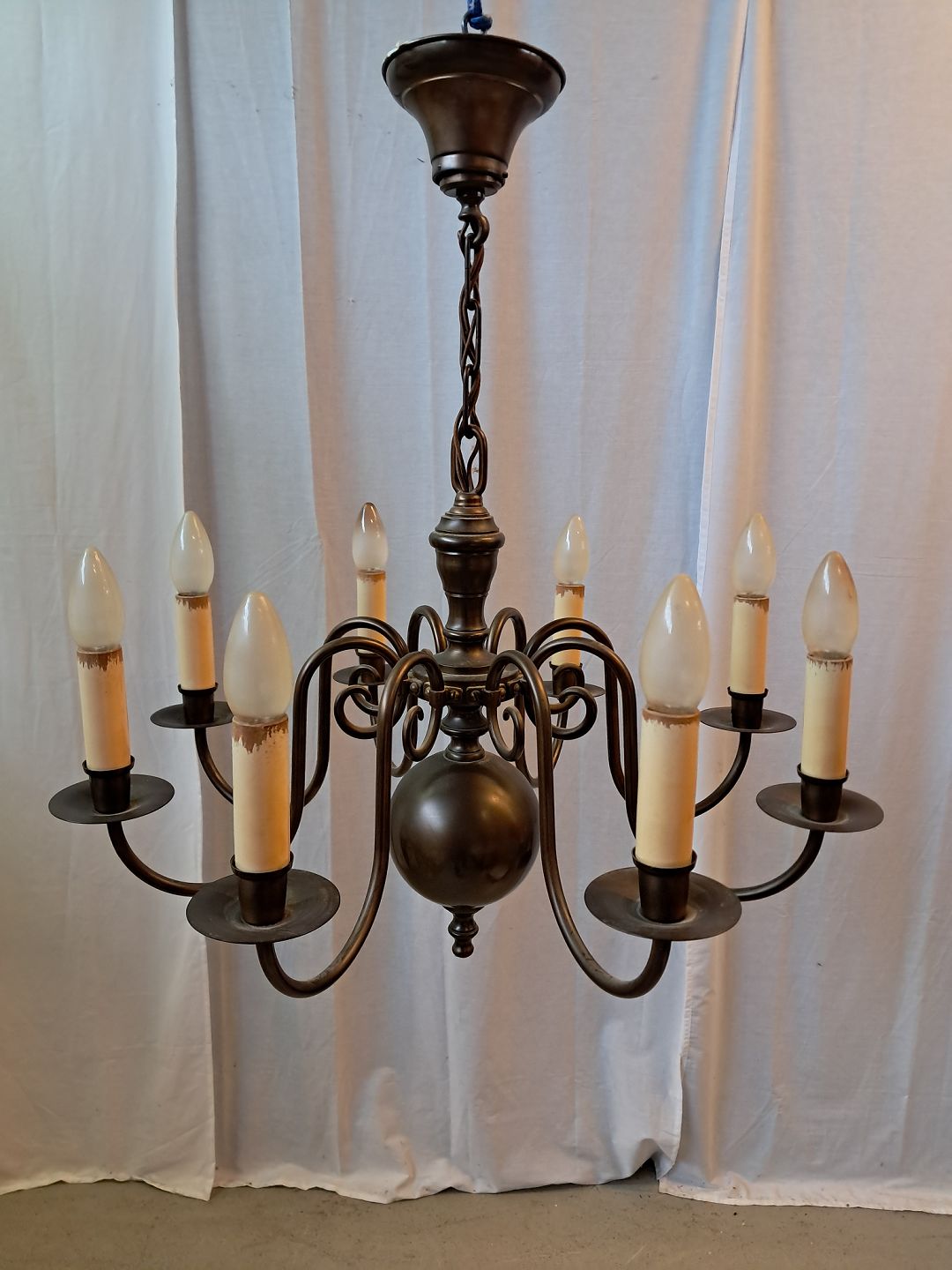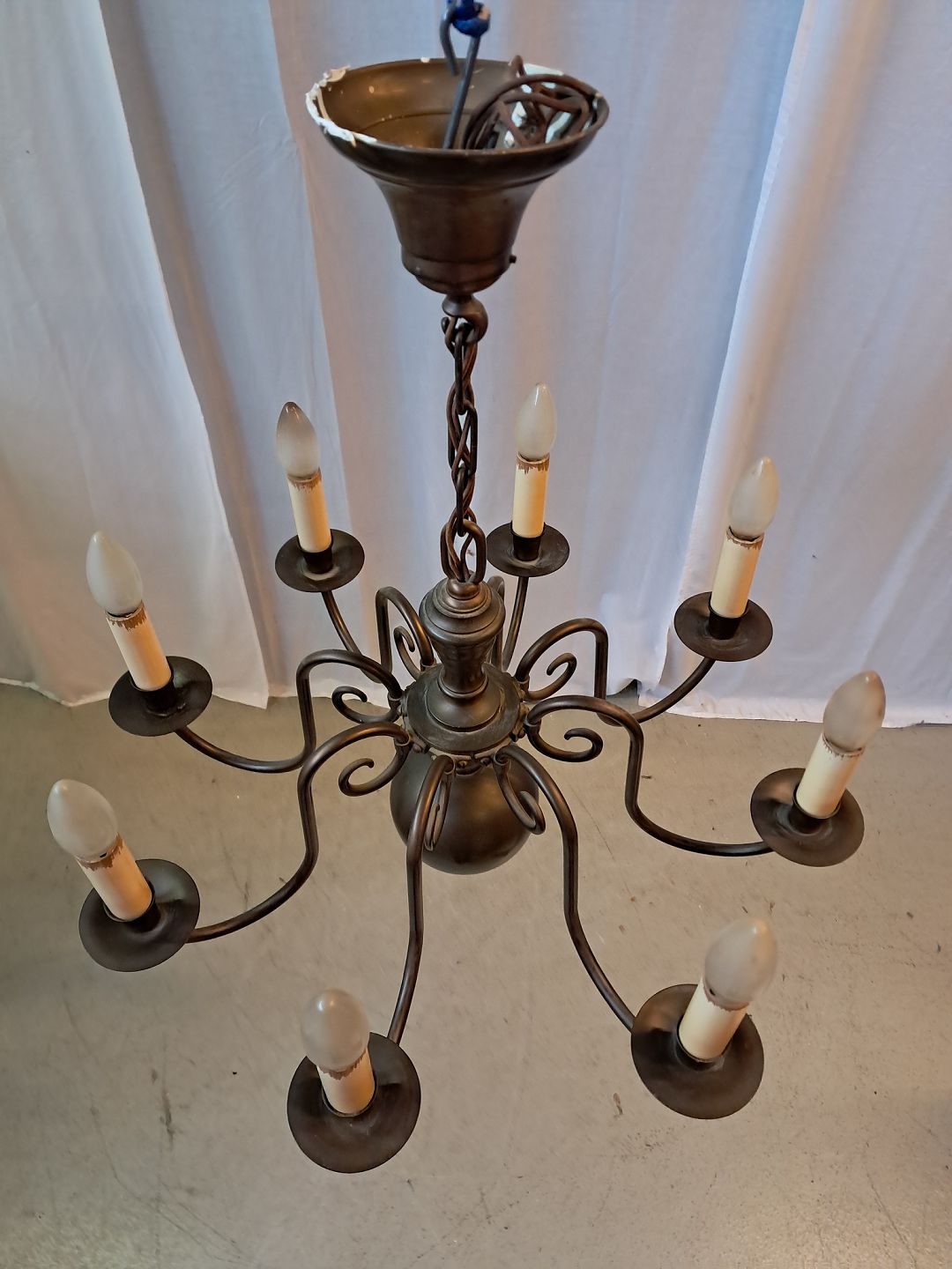 8-armet kirkekrone i bruneret messing, fra 1930erne. Den har brugsspor. Højde med kæde 65cm Diameter 61cm Emne nummer: 77473