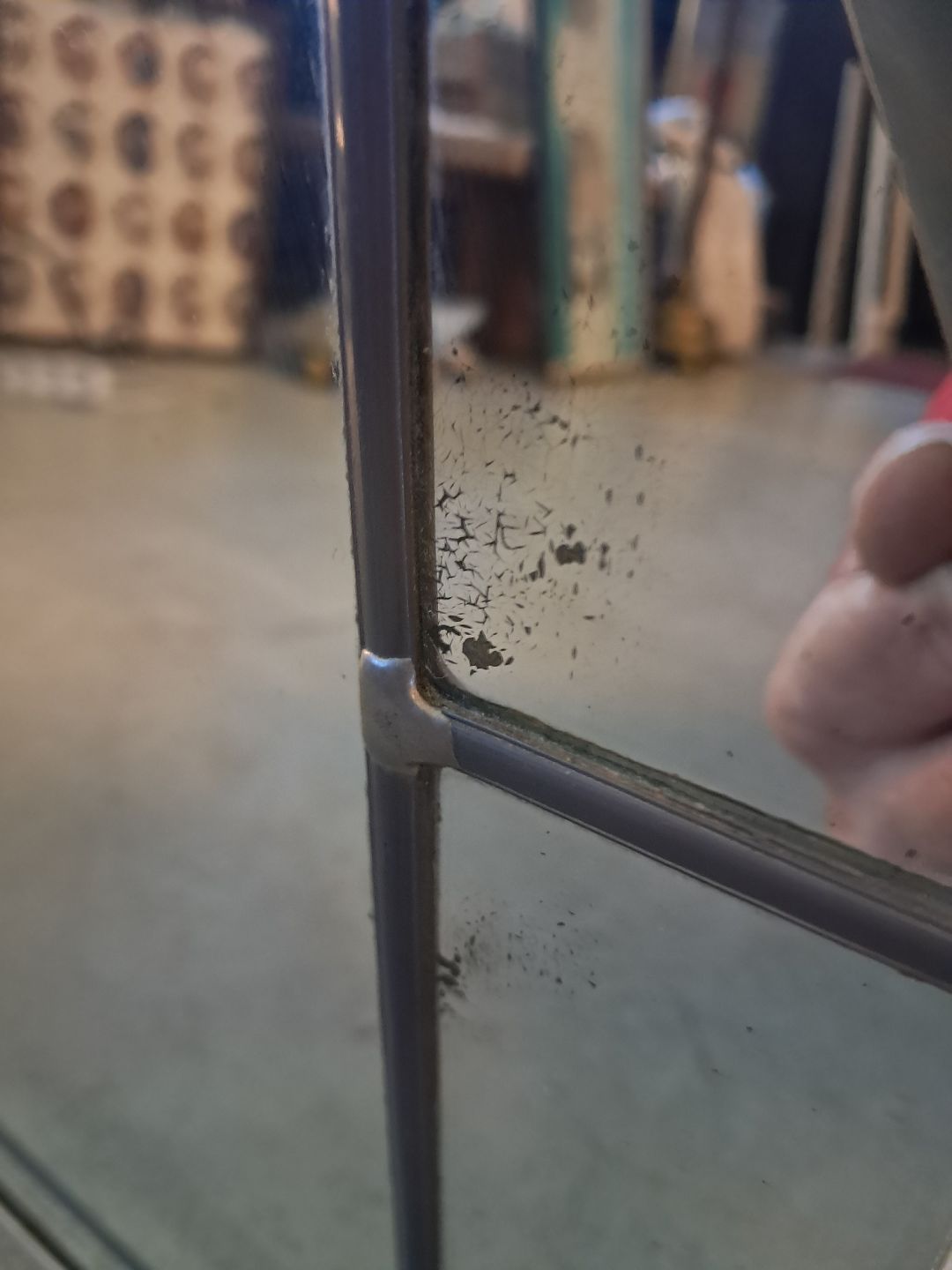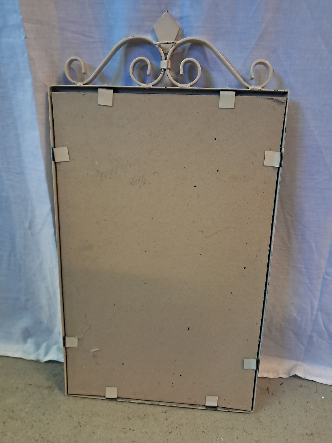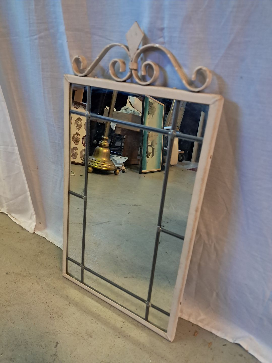 Spejl i malet smedejern med blyindfattet spejlglas, fra 1930erne. Det har brugsspor. Højde 61cm Bredde 33cm Emne nummer: 77499