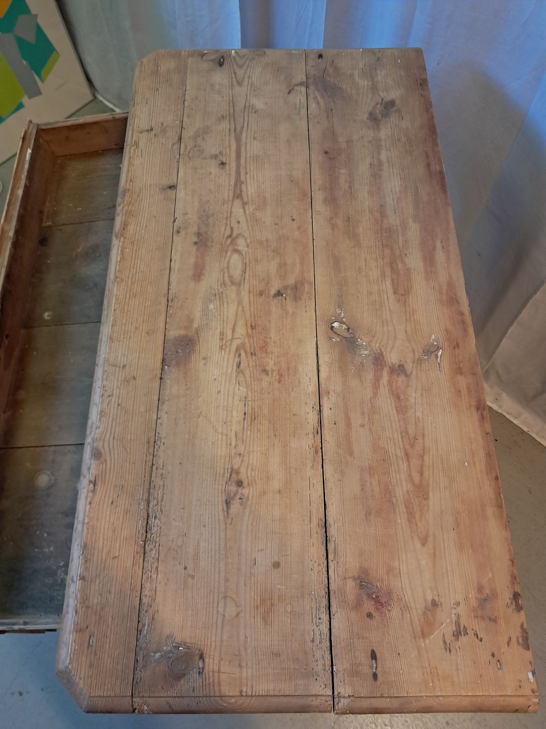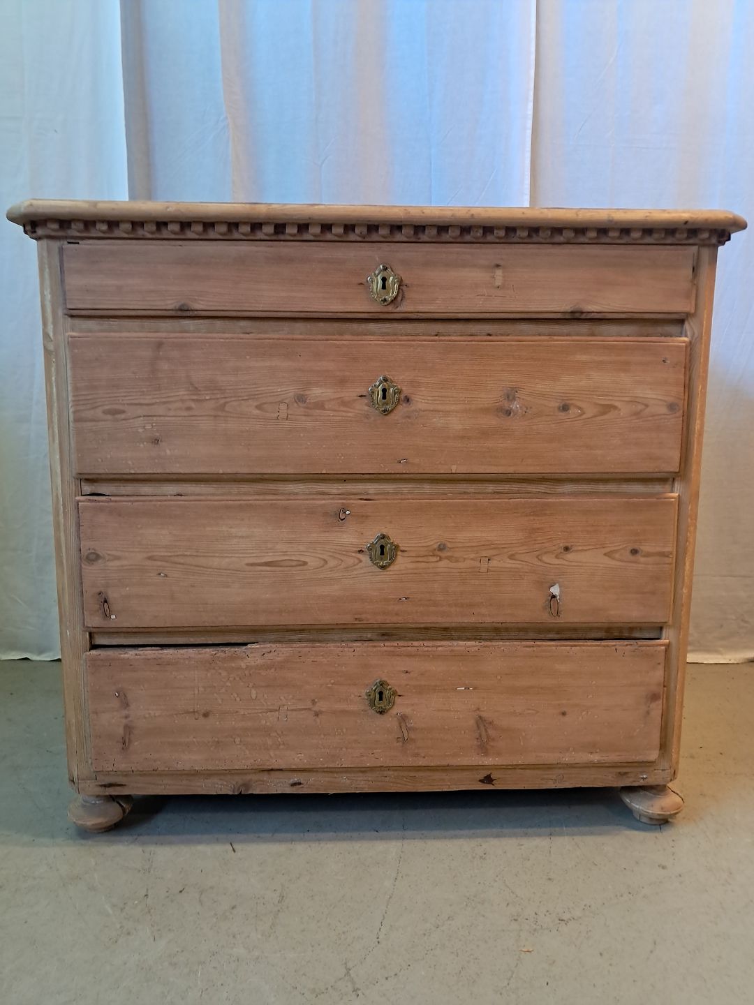 Kommode i massivt fyrretræ, fra 1910erne. Den har brugsspor og skufferne køre, men driller. Højde 91cm Bredde 99cm Dybde 50cm Emne nummer: 77505