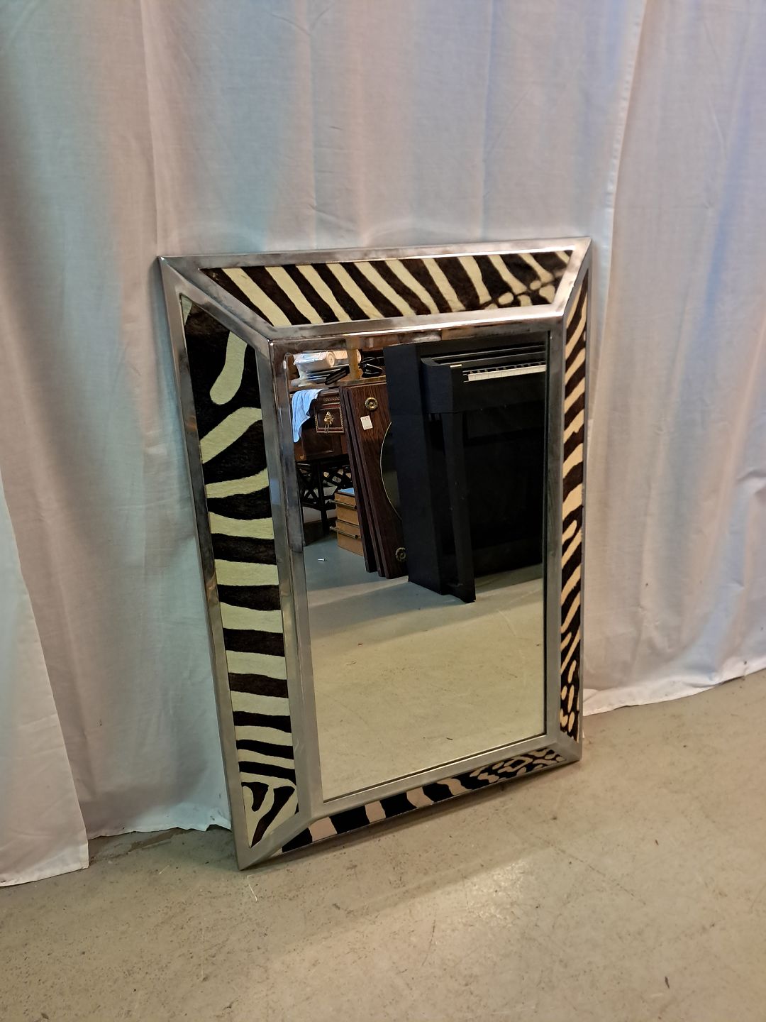 Spejl i metal og skind, fra 1990erne. Det har brugsspor. Højde 90cm Bredde 63cm Dybde 11cm Emne nummer: 77576