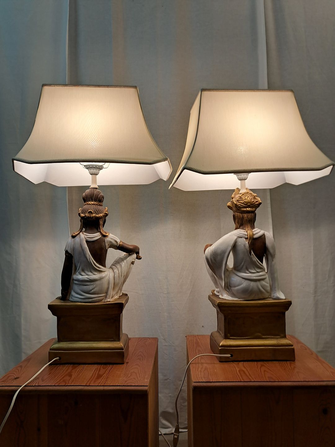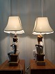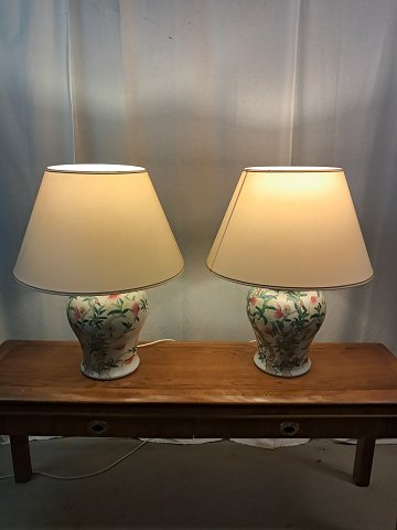 2 Bordlamper i pocelæn med skærme, fra 2000erne. Højde 83cm Skærmbredde 44cm Skærmdybde 33cm Emne nummer: 77604