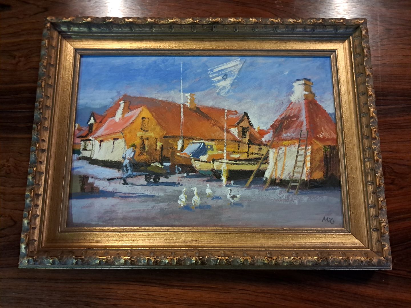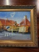 Maleri af Dragør Havn i guldmalet ramme, af : Mogens Amdi Thorsen (1924-2016) Det har brugsspor. Højde 34cm Bredde 46cm Emne nummer: 77643