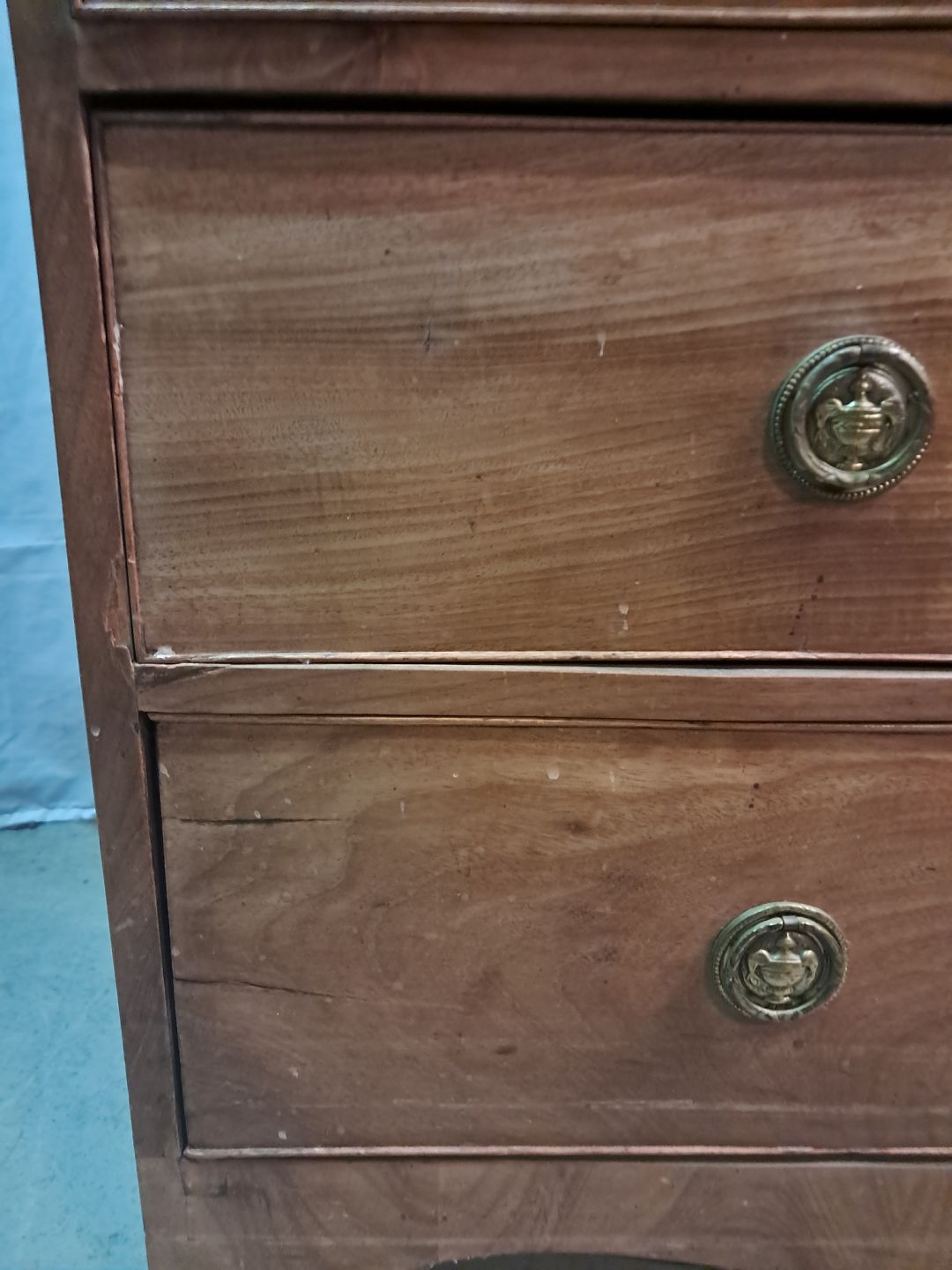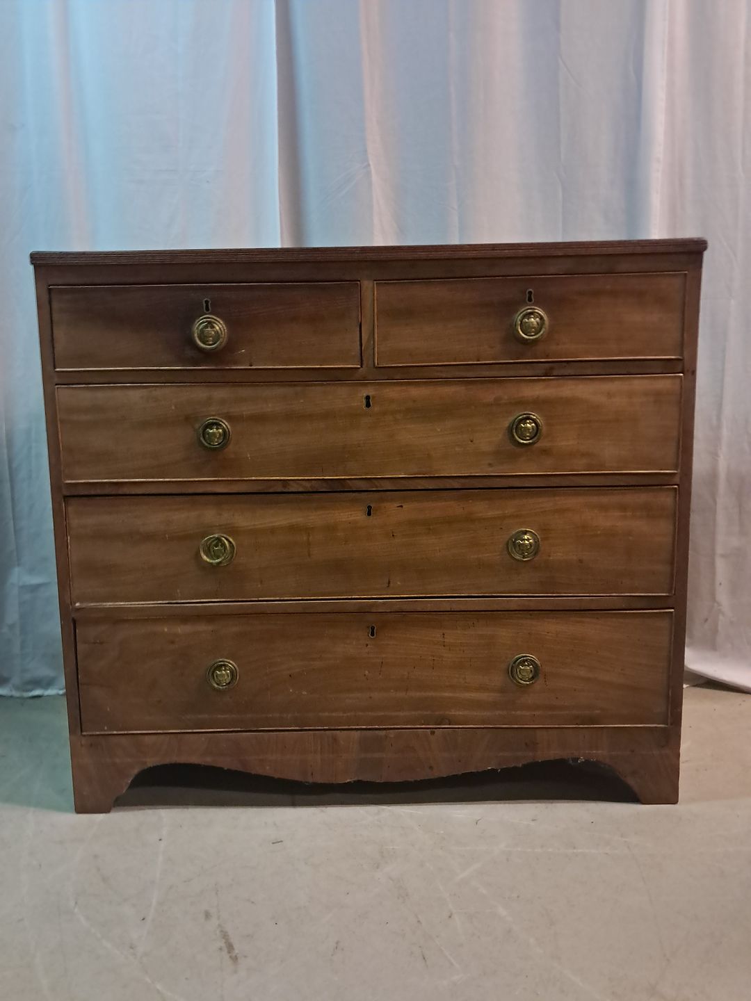 Kommode i fineret mahogni, fra 1920erne. Den har defekte lister, finer og brugsspor. Højde 96cm Bredde 197cm Dybde 50cm Emne nummer: 77672